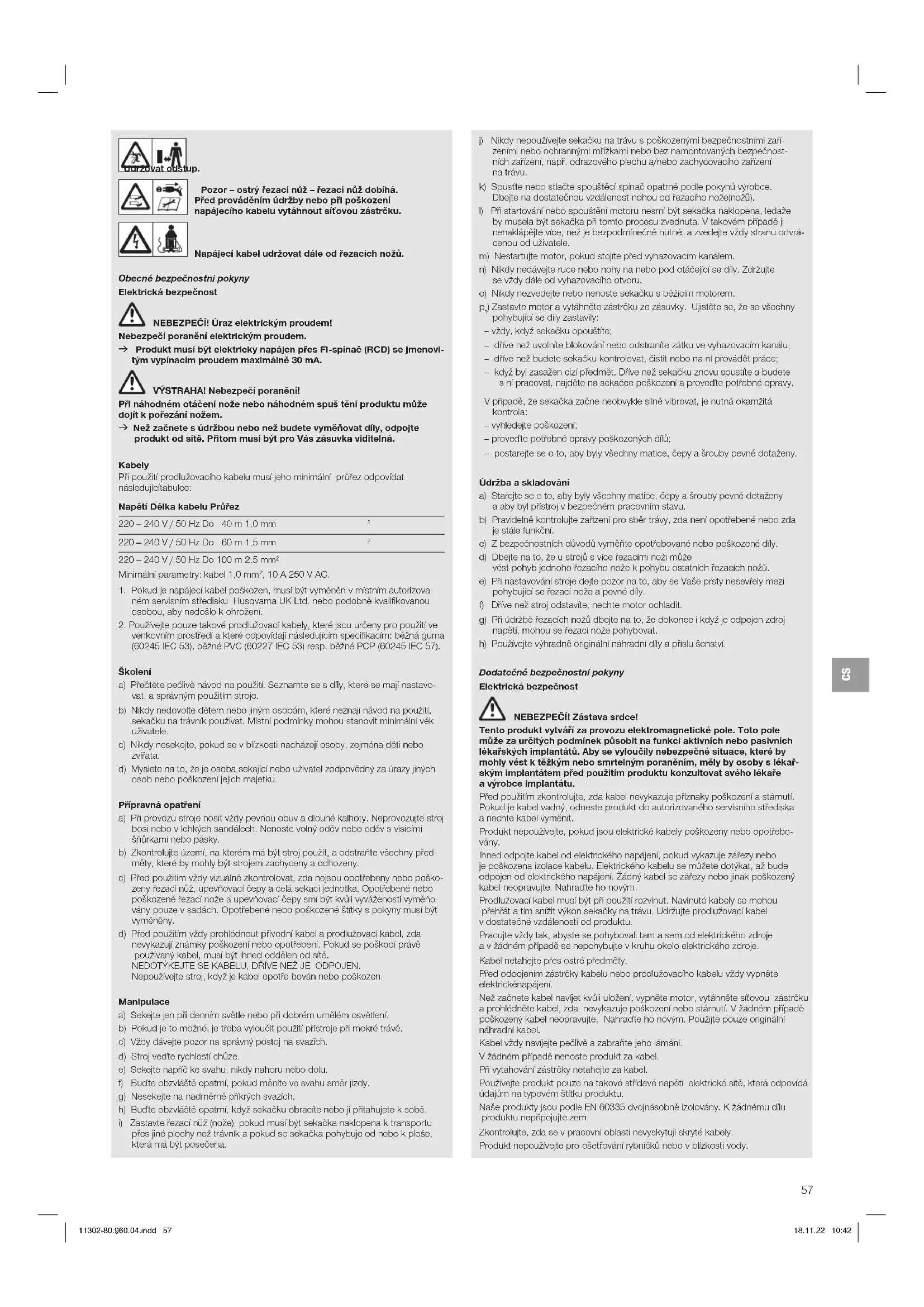Napájecí kabel udržovat dále od řezacích nožů. Obecné bezpečnostní pokyny Elektrická bezpečnost NEBEZPEČÍ! Úraz elektrickým proudem! Nebezpečí poranění elektrickým proudem. v Produkt musí být elektricky napájen přes FI-spínač (RCD) se jmenovi- tým vypínacím proudem maximálně 30 mA. VÝSTRAHA! Nebezpečí poranění! Při náhodném otáčení nože nebo náhodném spuš tění produktu může dojít k pořezání nožem. v Než začnete s údržbou nebo než budete vyměňovat díly, odpojte produkt od sítě. Přitom musí být pro Vás zásuvka viditelná. Kabely Při použití prodlužovacího kabelu musí jeho minimální průřez odpovídat následující tabulce: Napětí Délka kabelu Průřez 220 – 240 V / 50 Hz Do 40 m 1,0 mm