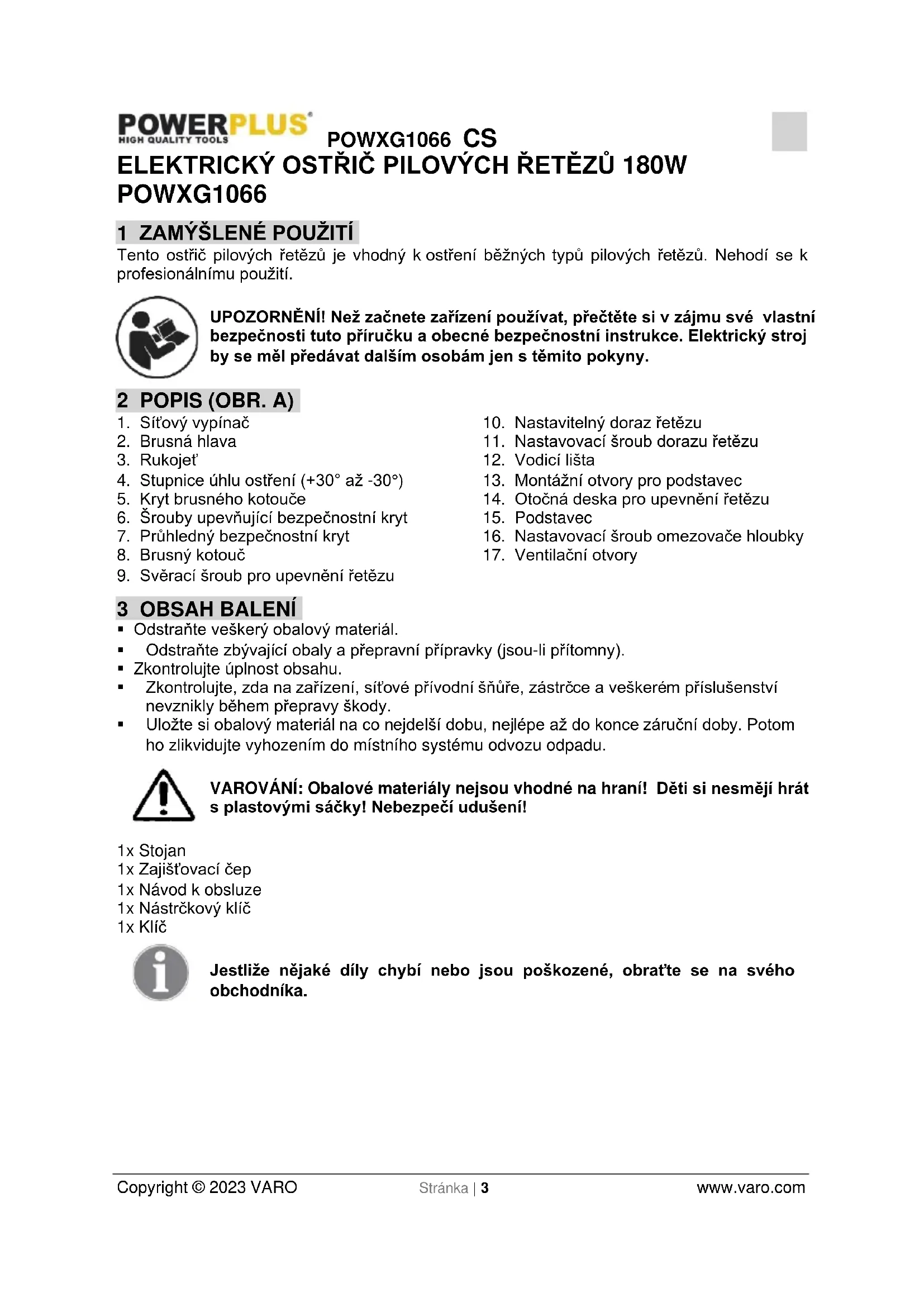 - Z bezpečnostních důvodů opotřebovaný napájecí kabel tohoto přístroje musí být vyměněn výrobcem, jeho servisním střediskem nebo osobou s podobnou kvalifikací.POWXG1066 CS Copyright © 2023 VARO Stránka | 5 www.varo.com