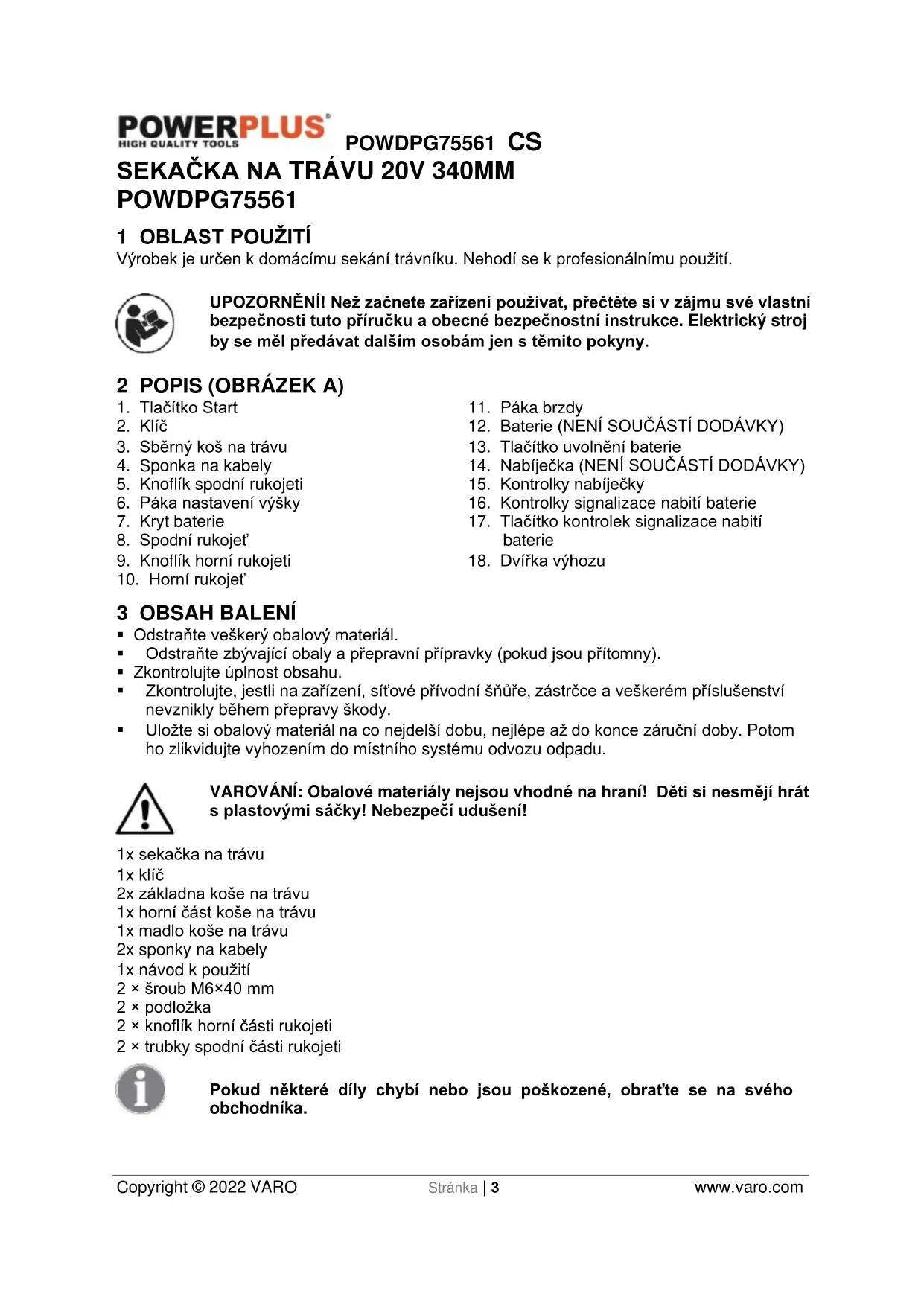 - Uvědomte si, že u strojů s více žacími noži může pohyb některého z nich vést i k otáčení dalších žacích nožů.POWDPG75561 CS Copyright © 2022 VARO Stránka | 7 www.varo.com