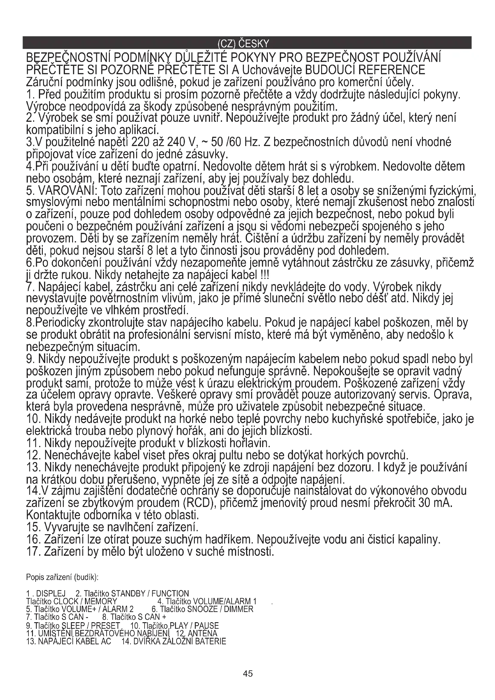 Technické údaje: Napájení: 230 ~V 50 Hz. Bluetooth: V 5.0 Baterie: 2x AAA 1,5V (baterie pouze pro zálohování hodin) FM: 87,5 – 108 MHz. Bezdrátové nabíjení: 5V 1A Ochrana životního prostředí. Kartón odevzdejte do sběru. Polyetylénové sáčky (PE) vyhazujte do kontejneru na plasty. Vysloužilý přístroj odevzdejte do příslušného sběrného dvoru, protože některé části zařízení mohou představovat pro životní prostředí nebezpečí. Elektrický přístroj odevzdejte tak, aby se omezilo jeho opětovné používání. Pokud jsou v přístroji baterie, vyjměte je a odevzdejte do příslušného sběrného místa zvlášť. Přístroj nevyhazujte do popelnic ani kontejneru na směsný odpad!! Adler Sp. z o.o., Ordona 2a, 01-237 Varšava, Polsko prohlašuje, že typ rádiového zařízení rádio CR 1180 odpovídá směrnici 2014/53 / EU. Úplné znění EU prohlášení z shoda je k dispozici na následující internetové adrese: https://adler.com.pl/dane/CE/ad_1192.pdf48 (RU) РУССКИЙ(RU) РУССКИЙ УСЛОВИЯ БЕЗОПАСНОСТИ ВАЖНЫЕ ИНСТРУКЦИИ ПО БЕЗОПАСНОСТИ ИСПОЛЬЗОВАНИЯ, ПОЖАЛУЙСТА, ВНИМАТЕЛЬНО ПРОЧИТАЙТЕ И СОХРАНИТЕ БУДУЩУЮ ССЫЛКУ Условия гарантии отличаются, если устройство используется в коммерческих целях.