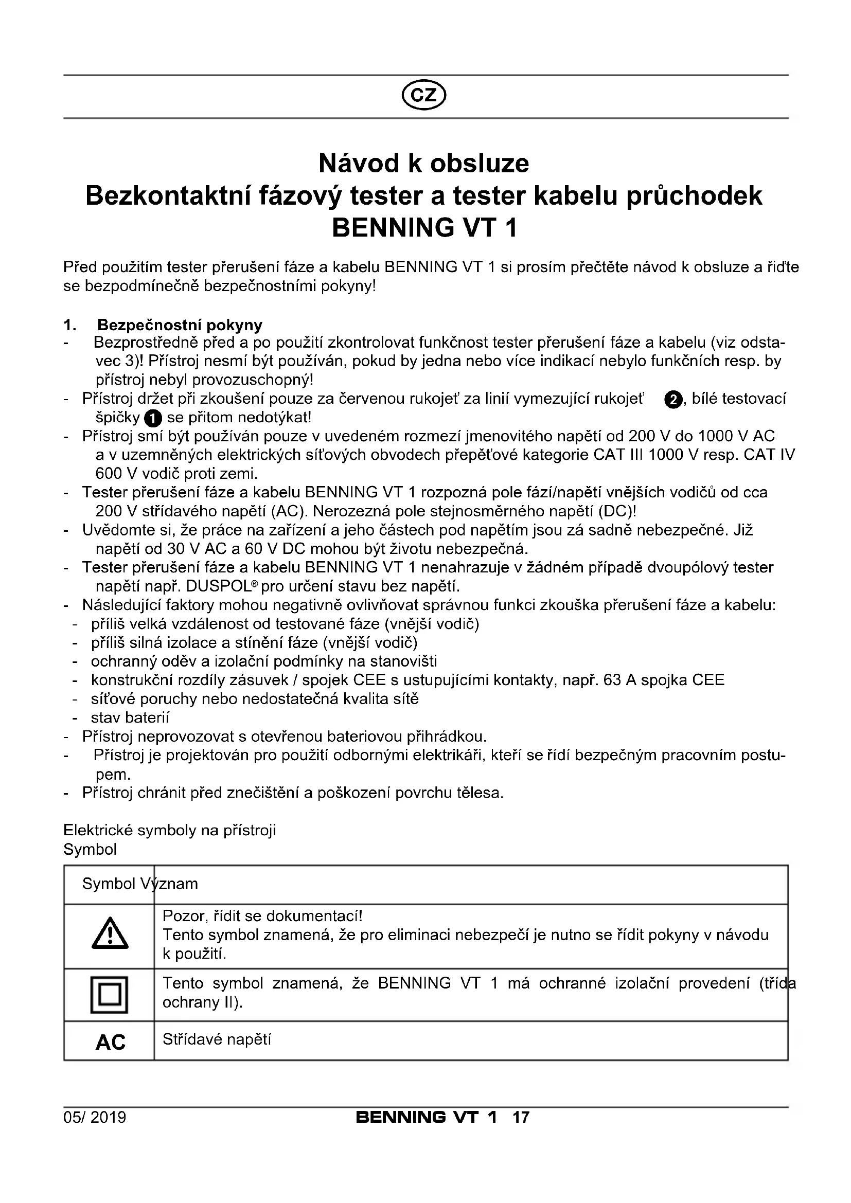 Návodkobsluze Bezkontaktnífázovýtesteratesterkabeluprůchodek BENNING VT 1 Před použitím tester přerušení fáze a kabelu BENNING VT 1 si prosím přečtěte návod k obsluze a řiďte se bezpodmínečně bezpečnostními pokyny!1. Bezpečnostnípokyny - Bezprostředně před a po použití zkontrolovat funkčnost tester přerušení fáze a kabelu (viz odsta- vec 3)! Přístroj nesmí být používán, pokud by jedna nebo více indikací nebylo funkčních resp. by přístroj nebyl provozuschopný!- Přístroj držet při zkoušení pouze za červenou rukojeť za linií vymezující rukojeť , bílé testovací špičky se přitom nedotýkat! - Přístroj smí být používán pouze v uvedeném rozmezí jmenovitého napětí od 200 V do 1000 V AC a v uzemněných elektrických síťových obvodech přepěťové kategorie CAT III 1000 V resp. CAT IV 600 V vodič proti zemi.- Tester přerušení fáze a kabelu BENNING VT 1 rozpozná pole fází/napětí vnějších vodičů od cca 200 V střídavého napětí (AC). Nerozezná pole stejnosměrného napětí (DC)!- Uvědomte si, že práce na zařízení a jeho částech pod napětím jsou zá sadně nebezpečné. Již napětí od 30 V AC a 60 V DC mohou být životu nebezpečná. - Tester přerušení fáze a kabelu BENNING VT 1 nenahrazuje v žádném případě dvoupólový tester napětí např. DUSPOL pro určení stavu bez napětí.- Následující faktory mohou negativně ovlivňovat správnou funkci zkouška přerušení fáze a kabelu: - příliš velká vzdálenost od testované fáze (vnější vodič) - příliš silná izolace a stínění fáze (vnější vodič) - ochranný oděv a izolační podmínky na stanovišti - konstrukční rozdíly zásuvek / spojek CEE s ustupujícími kontakty, např. 63 A spojka CEE - síťové poruchy nebo nedostatečná kvalita sítě - stav baterií- Přístroj neprovozovat s otevřenou bateriovou přihrádkou. - Přístroj je projektován pro použití odbornými elektrikáři, kteří se řídí bez pečným pracovním postu- pem. - Přístroj chránit před znečištění a poškození povrchu tělesa.Elektrické symboly na přístrojiSymbol Symbol Význam Pozor, řídit se dokumentací!Tento symbol znamená, že pro eliminaci nebezpečí je nutno se řídit pokyny v návodu k použití.Tento symbol znamená, že BENNING VT 1 má ochranné izolační provedení (třída ochrany II). Střídavé napětí05/ 2019 BENNING VT 1