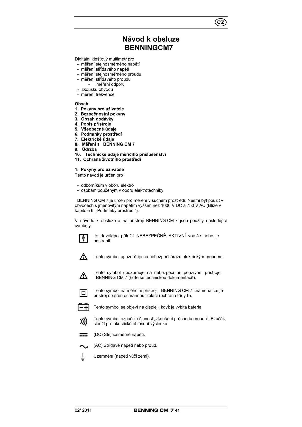 Návod k obsluze BENNING CM 7 Digitální klešťový multimetr pro - měření stejnosměrného napětí - měření střídavého napětí - měření stejnosměrného proudu - měření střídavého proudu - měření odporu - zkoušku obvodu - měření frekvence Obsah