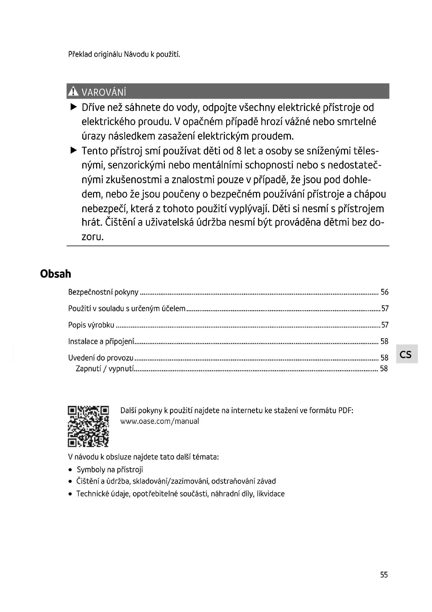 - Při potížích kontaktujte autorizovaný zákaznický servis nebo společnost OASE.CS