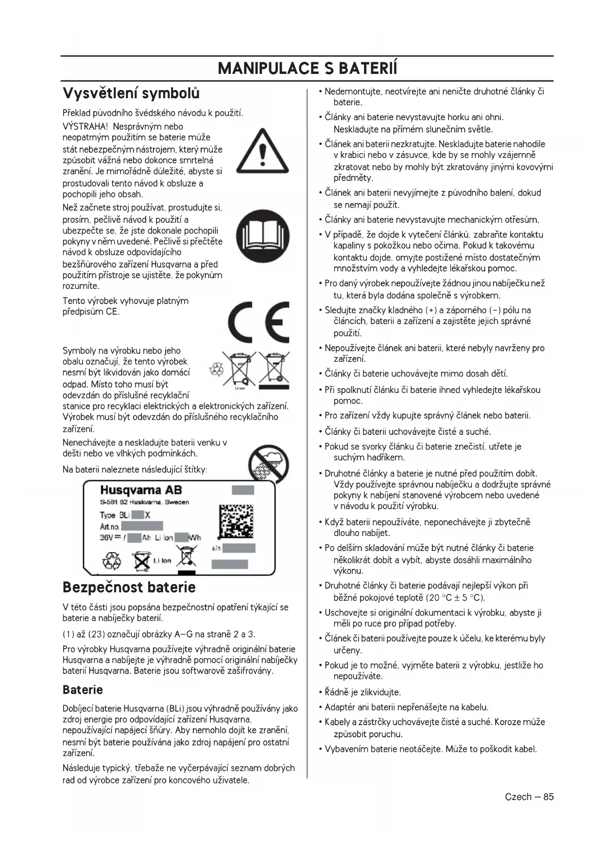 Czech – 85 Vysvûtlení symbolÛ Pfieklad pÛvodního ‰védského návodu k pouÏití. V¯STRAHA! Nesprávn˘m nebo neopatrn˘m pouÏitím se baterie mÛÏe stát nebezpeãn˘m nástrojem, kter˘ mÛÏe zpÛsobit váÏná nebo dokonce smrtelná zranûní. Je mimofiádnû dÛleÏité, abyste si prostudovali tento návod k obsluze a pochopili jeho obsah. NeÏ zaãnete stroj pouÏívat, prostudujte si, prosím, peãlivû návod k pouÏití a ubezpeãte se, Ïe jste dokonale pochopili pokyny v nûm uvedené. Peãlivû si pfieãtûte návod k obsluze odpovídajícího bez‰ÀÛrového zafiízení Husqvarna a pfied pouÏitím pfiístroje se ujistûte, Ïe pokynÛm rozumíte. Tento v˘robek vyhovuje platn˘m pfiedpisÛm CE. Symboly na v˘robku nebo jeho obalu oznaãují, Ïe tento v˘robek nesmí b˘t likvidován jako domácí odpad. Místo toho musí b˘t odevzdán do pfiíslu‰né recyklaãní stanice pro recyklaci elektrick˘ch a elektronick˘ch zafiízení. V˘robek musí b˘t odevzdán do pfiíslu‰ného recyklaãního zafiízení. Nenechávejte a neskladujte baterii venku v de‰ti nebo ve vlhk˘ch podmínkách. Na baterii naleznete následující ‰títky: Bezpeãnost baterie V této ãásti jsou popsána bezpeãnostní opatfiení t˘kající se baterie a nabíjeãky baterií. (1) aÏ (23) oznaãují obrázky A–G na stranû 2 a 3. Pro v˘robky Husqvarna pouÏívejte v˘hradnû originální baterie Husqvarna a nabíjejte je v˘hradnû pomocí originální nabíjeãky baterií Husqvarna. Baterie jsou softwarovû za‰ifrovány. Baterie Dobíjecí baterie Husqvarna (BLi) jsou v˘hradnû pouÏívány jako zdroj energie pro odpovídající zafiízení Husqvarna, nepouÏívající napájecí ‰ÀÛry. Aby nemohlo dojít ke zranûní, nesmí b˘t baterie pouÏívána jako zdroj napájení pro ostatní zafiízení. Následuje typick˘, tfiebaÏe ne vyãerpávající seznam dobr˘ch rad od v˘robce zafiízení pro koncového uÏivatele.