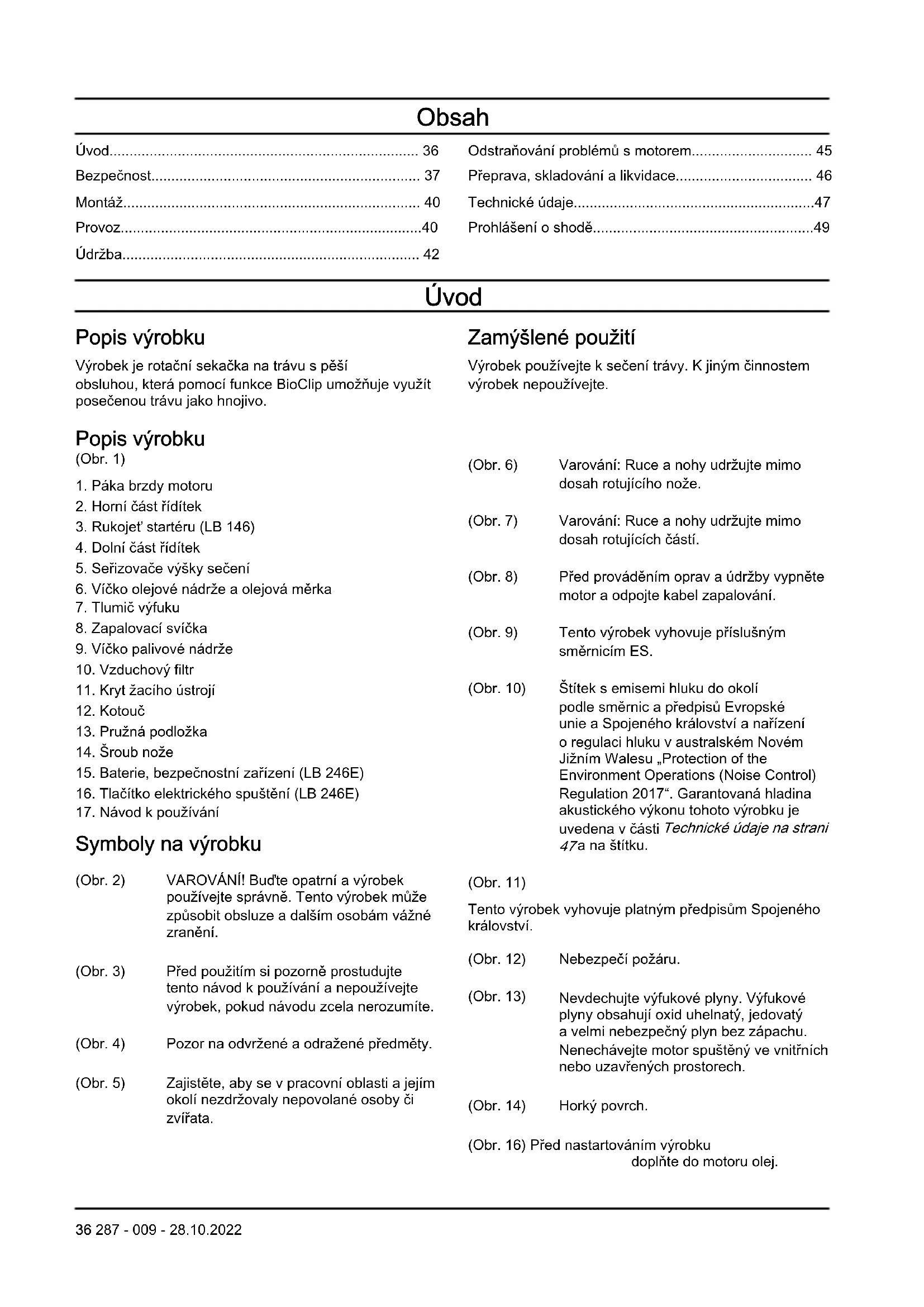 ana štítku. (Obr. 11) Tento výrobek vyhovuje platným předpisům Spojeného království. (Obr. 12) Nebezpečí požáru. (Obr. 13) Nevdechujte výfukové plyny. Výfukové plyny obsahují oxid uhelnatý, jedovatý avelmi nebezpečný plyn bez zápachu. Nenechávejte motor spuštěný ve vnitřních nebo uzavřených prostorech. (Obr. 14) Horký povrch. (Obr. 16) Před nastartováním výrobku doplňte do motoru olej. 36 287 - 009 - 28.10.2022(Obr. 17) Startovací proces pro LB 146: Zatlačte rukojeť brzdy motoru směrem dolů atahejte za ru- kojeť startovací šňůry. (Obr. 18) Startovací proces pro LB 246E: Zatlačte rukojeť brzdy motoru směrem dolů astis- kněte tlačítko startování. (Obr. 15) Skenovatelný kód. Povšimněte si: Další symboly/štítky na produktu se týkají certifikačních požadavků pro další komerční oblasti. Odpovědnost za výrobek Jak uvádí zákon o odpovědnosti za výrobek, neneseme odpovědnost za žádnou škodu způsobenou našim výrobkem, pokud: