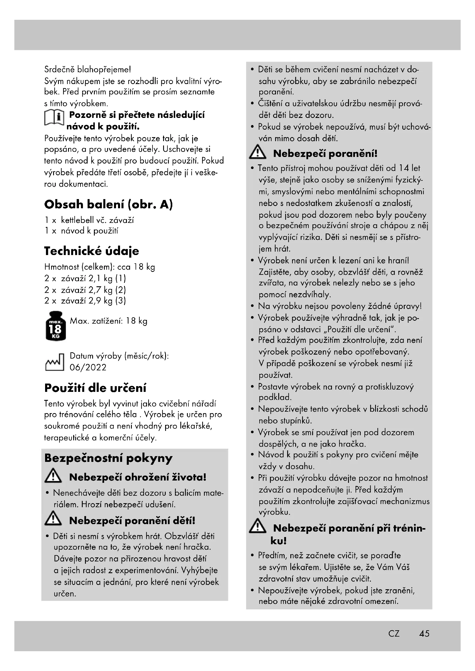 Max. zatížení: 18 kg Datum výroby (měsíc/rok): 06/2022 Použití dle určení Tento výrobek byl vyvinut jako cvičební nářadí pro trénování celého těla . Výrobek je určen pro soukromé použití a není vhodný pro lékařské, terapeutické a komerční účely. Bezpečnostní pokyny Nebezpečí ohrožení života!