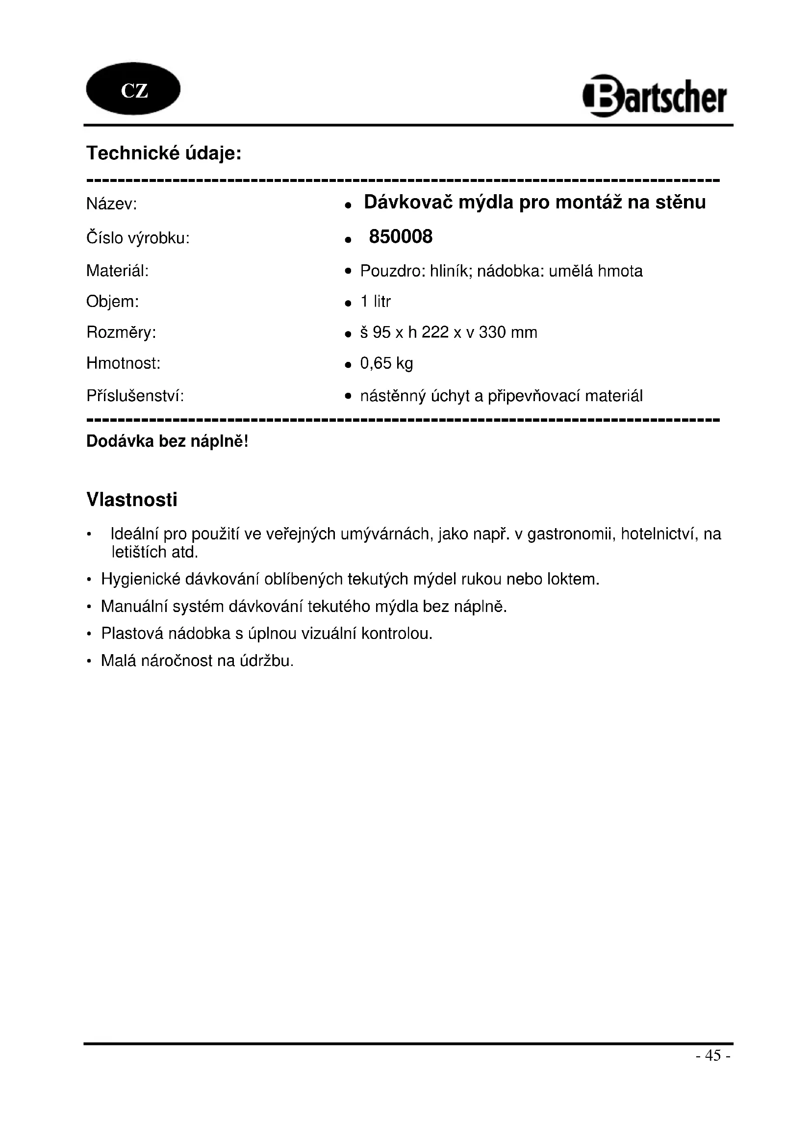850008 - Dávkovač mýdla BARTSCHER - Bezplatný návod k obsluze