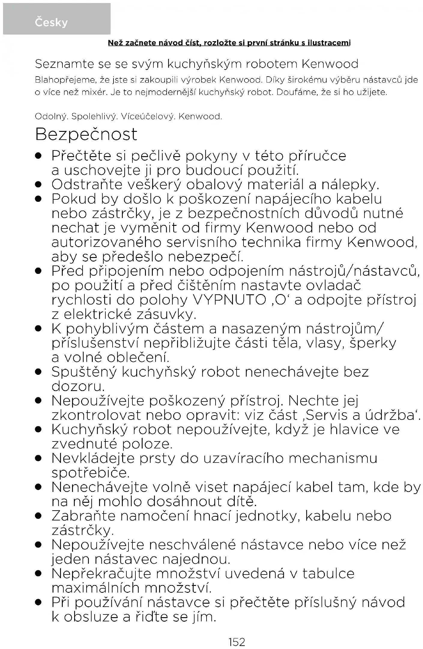 Při používání nástavce si přečtěte příslušný návod k obsluze a řiďte se jím. Česky Než začnete návod číst, rozložte si první stránku s ilustracemi 152O Při zvedání spotřebiče buďte opatrní, protože je těžký. Před zvednutím zkontrolujte, zda je hlavice správně zajištěná v dolní poloze a zda jsou mísa, nástroje, kryty výstupů a napájecí kabel zajištěné.