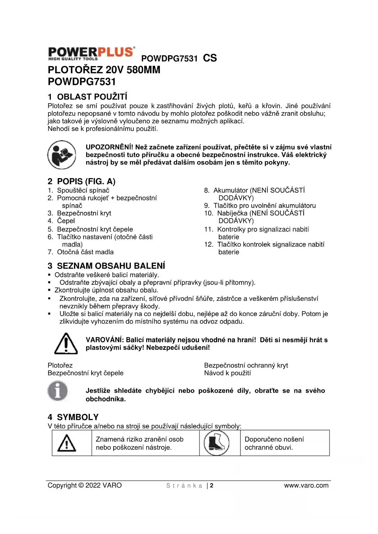 VARO – Vic. Van Rompuy N.V. - Joseph Van Instraat 9 - BE2500 Lier - BELGIUM, prohlašuje, že Typ zařízení: Plotořez Značka: PowerPlus Číslo položky: POWDPG7531 je ve shodě se základními požadavky a ostatními relevantními ustanoveními příslušných evropských směrnic založených na aplikaci evropských harmonizovaných norem. Jakákoliv neschválená úprava přístroje vede ke ztrátě platnosti tohoto prohlášení. Evropské směrnice (včetně, nastanou-li, jejich změn a doplňků až do data podpisu); 2011/65/EU 2006/42/EC 2014/30/EU 2000/14/EC Annex V LwA Measured 90 dB(A) Guaranteed 93 dB(A) Evropské harmonizované normy (včetně, nastanou-li, jejich změn a doplňků až do data podpisu); EN60745-1 : 2009 EN60745-2-15 : 2009 EN55014-1 : 2017 EN55014-2 : 2015 Držitel technické dokumentace: Philippe Vankerkhove, VARO - Vic. Van Rompuy N.V. Níže podepsaný jedná jménem vedení společnosti, Ludo Mertens Regulativní postupy - Manažer pro dohled nad řádným jednáním 30/12/2021, Lier - BelgiumPOWDPG7531 SK copyright © 2022 VARO S t r a n a | 1 www.varo.com 1 POUŽÍVANIE .................................................................................... 3