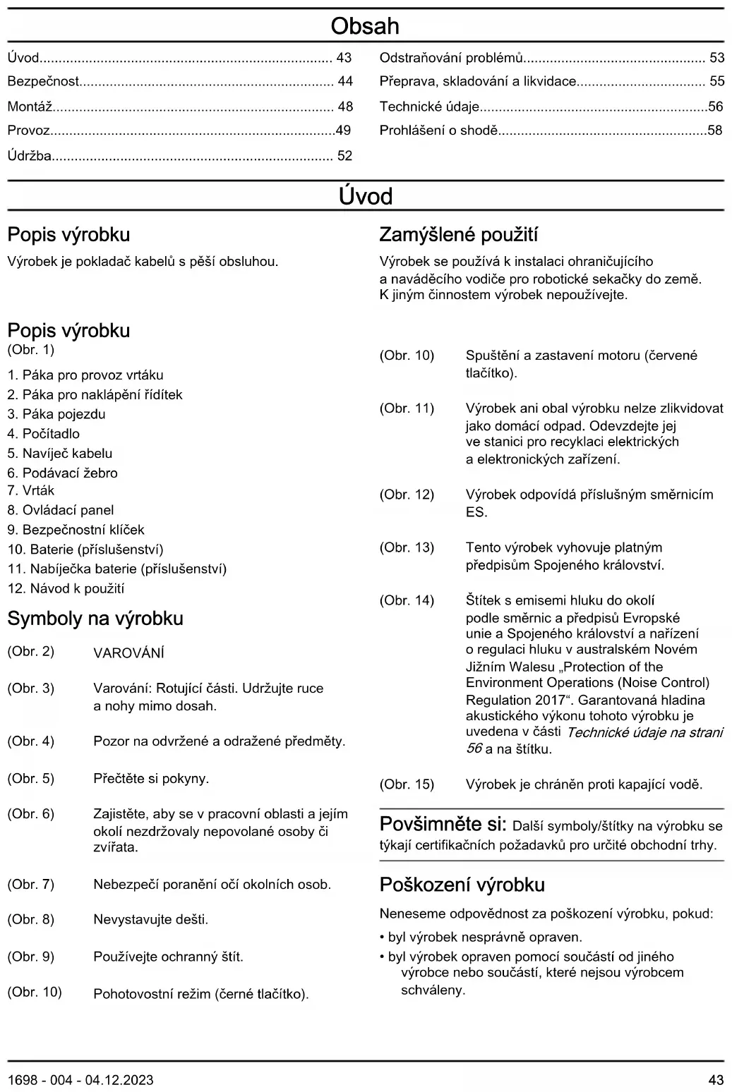 Symboly na výrobku (Obr. 2) VAROVÁNÍ (Obr. 3) Varování: Rotující části. Udržujte ruce anohy mimo dosah. (Obr. 4) Pozor na odvržené aodražené předměty. (Obr. 5) Přečtěte si pokyny. (Obr. 6) Zajistěte, aby se vpracovní oblasti ajejím okolí nezdržovaly nepovolané osoby či zvířata. (Obr. 7) Nebezpečí poranění očí okolních osob. (Obr. 8) Nevystavujte dešti. (Obr. 9) Používejte ochranný štít. (Obr. 10) Pohotovostní režim (černé tlačítko). (Obr. 10) Spuštění azastavení motoru (červené tlačítko). (Obr. 11) Výrobek ani obal výrobku nelze zlikvidovat jako domácí odpad. Odevzdejte jej ve stanici pro recyklaci elektrických aelektronických zařízení. (Obr. 12) Výrobek odpovídá příslušným směrnicím ES. (Obr. 13) Tento výrobek vyhovuje platným předpisům Spojeného království. (Obr. 14) Štítek semisemi hluku do okolí podle směrnic apředpisů Evropské unie aSpojeného království anařízení oregulaci hluku vaustralském Novém Jižním Walesu „Protection of the Environment Operations (Noise Control) Regulation 2017“. Garantovaná hladina akustického výkonu tohoto výrobku je uvedena včásti Technické údaje na strani