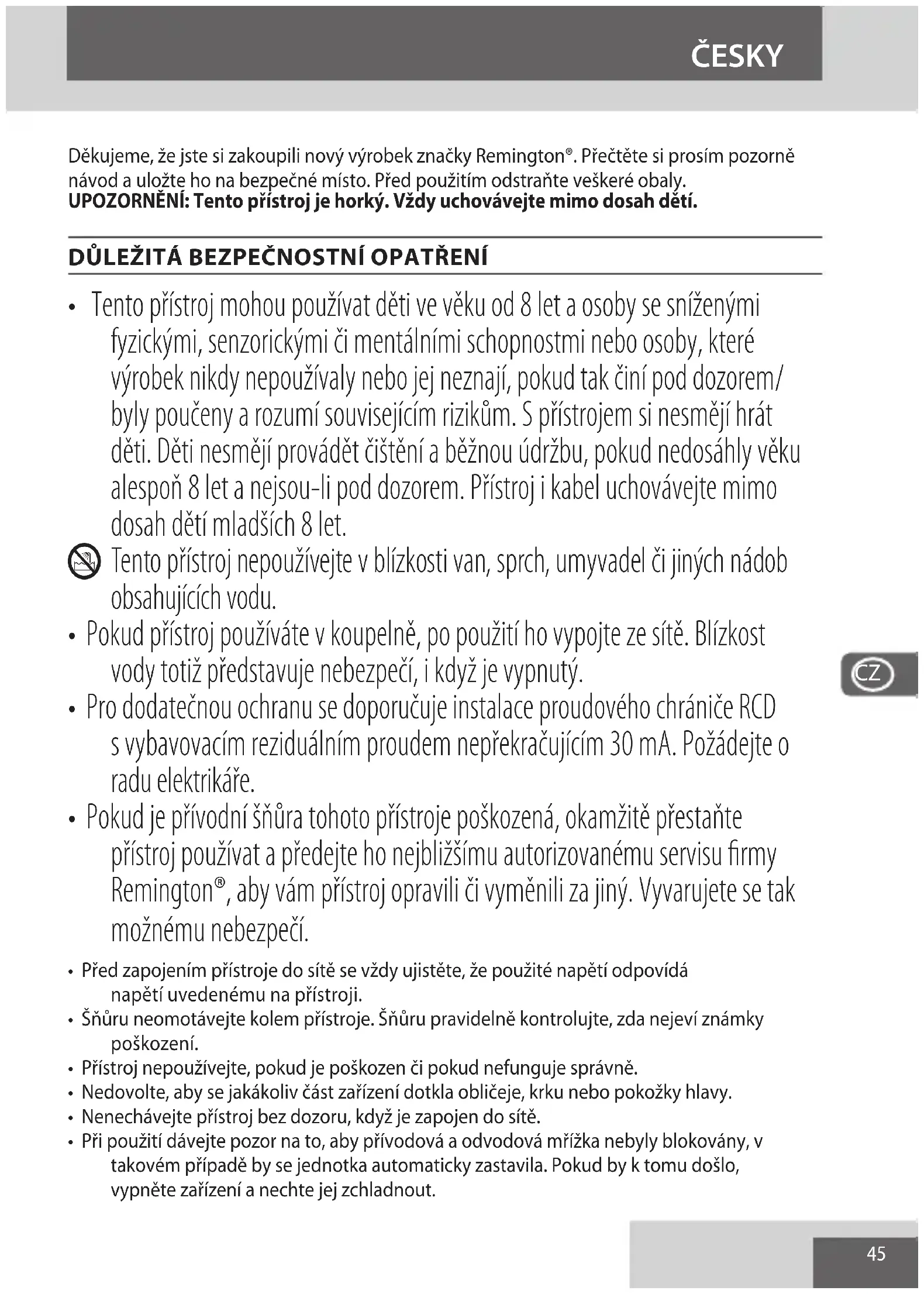 - Pokud je přívodní šňůra tohoto přístroje poškozená, okamžitě přestaňte přístroj používat a předejte ho nejbližšímu autorizovanému servisu firmy Remington®, aby vám přístroj opravili či vyměnili za jiný. Vyvarujete se tak možnému nebezpečí.