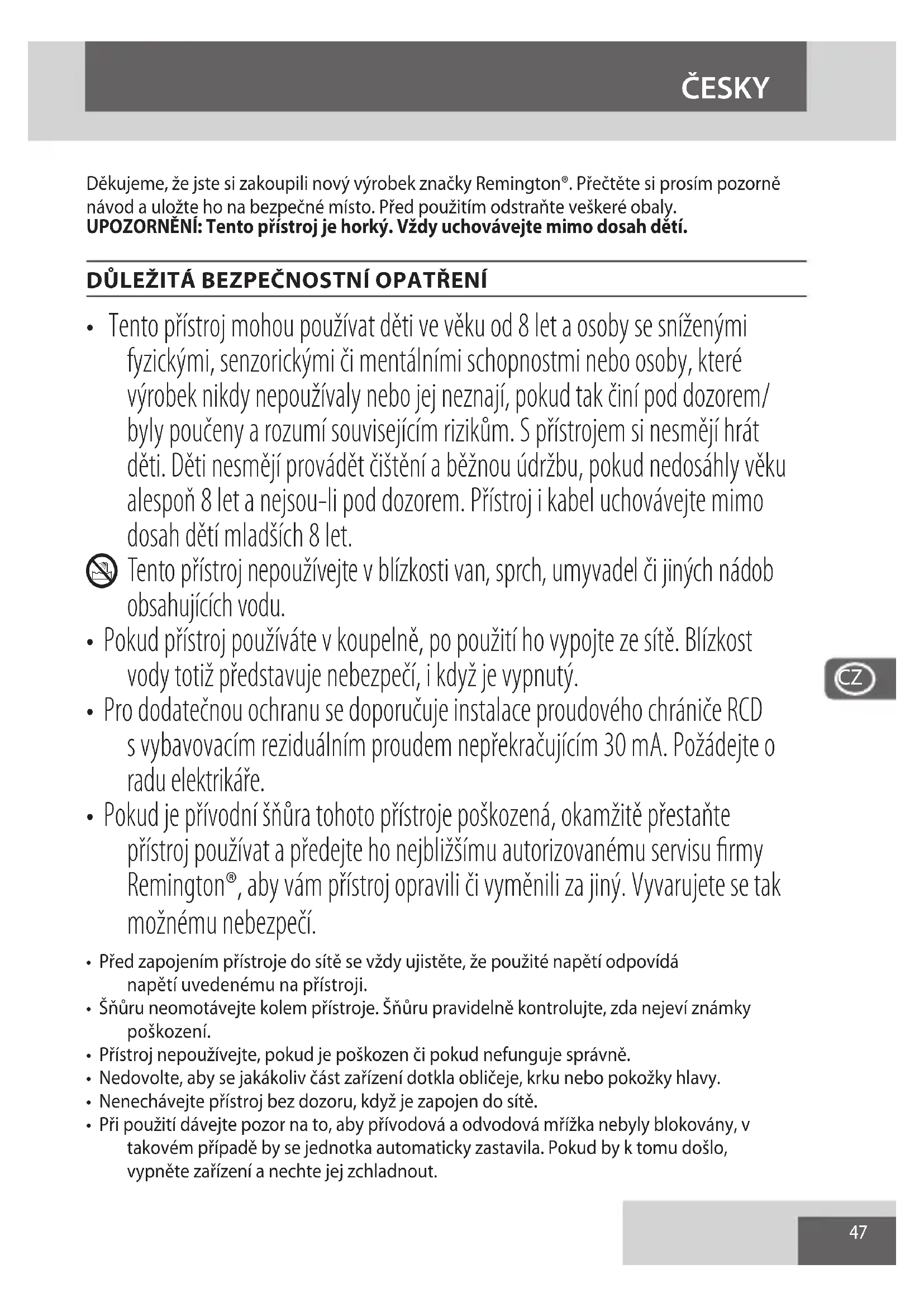 - Pokud je přívodní šňůra tohoto přístroje poškozená, okamžitě přestaňte přístroj používat a předejte ho nejbližšímu autorizovanému servisu firmy Remington®, aby vám přístroj opravili či vyměnili za jiný. Vyvarujete se tak možnému nebezpečí.