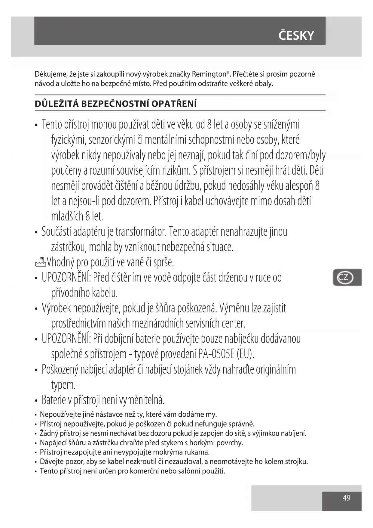 Aby nedocházelo k ničení životního prostředí a zdraví kvůli obsaženým nebezpečným látkám, přístroje a dobíjecí i nedobíjecí baterie označené jedním z těchto symbolů nesmějí být vyhazovány do směsného komunálního odpadu. Elektrické a elektronické výrobky, a pokud to přísluší, i dobíjecí i nedobíjecí baterie, vždy likvidujte na ociálním recyklačním/sběrném místě.53 Dziękujemy za zakup nowego produktu Remington®. Przed użyciem zapoznaj się uważnie z instrukcją obsługi i zachowaj ją na przyszłość. Przed użyciem wyjmij z opakowania. WAŻNE WSKAZÓWKI DOTYCZĄCE BEZPIECZEŃSTWA