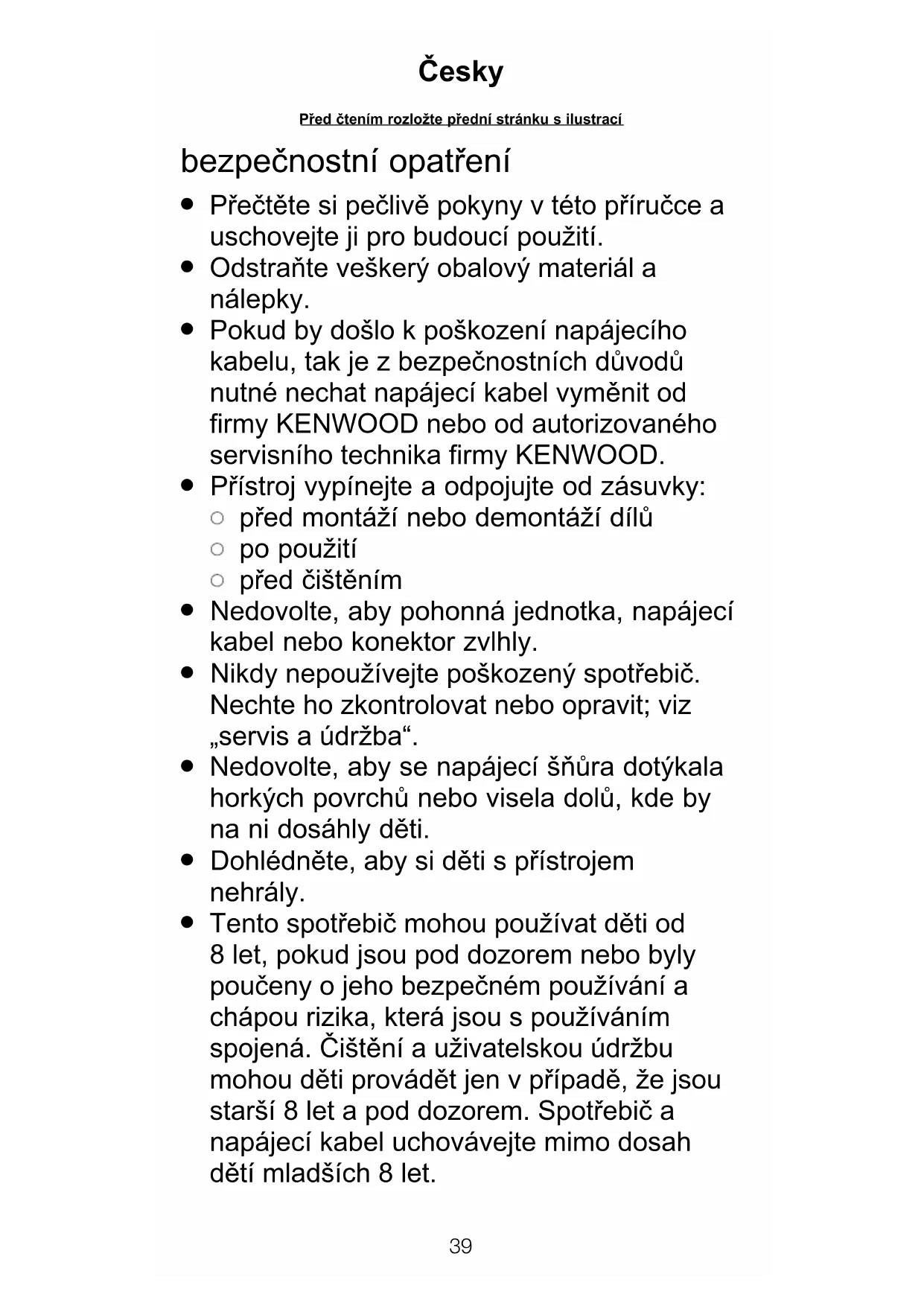 Tento spotřebič mohou používat děti od 8 let, pokud jsou pod dozorem nebo byly poučeny o jeho bezpečném používání a chápou rizika, která jsou s používáním spojená. Čištění a uživatelskou údržbu mohou děti provádět jen v případě, že jsou starší 8 let a pod dozorem. Spotřebič a napájecí kabel uchovávejte mimo dosah dětí mladších 8 let. P¡ed ïtením rozlo¥te p¡ední stránku s ilustrací Ïesky39 40