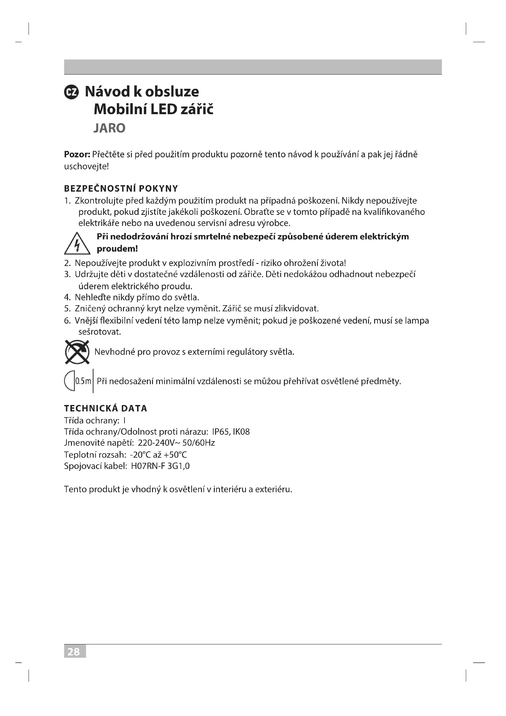 sešrotovat. Nevhodné pro provoz s externími regulátory světla. Při nedosažení minimální vzdálenosti se můžou přehřívat osvětlené předměty. TECHNICKÁ DATA Třída ochrany: I Třída ochrany/Odolnost proti nárazu: IP65, IK08 Jmenovité napětí: 220-240V~ 50/60Hz Teplotní rozsah: -20°C až +50°C Spojovací kabel: H07RN-F 3G1,0 Tento produkt je vhodný k osvětlení v interiéru a exteriéru. 20P117 Mobiler LED Strahler Jaro 10-50W 0533125 210409.indd 28 09.04.2021 13:15:352929 JARO Návod k obsluze