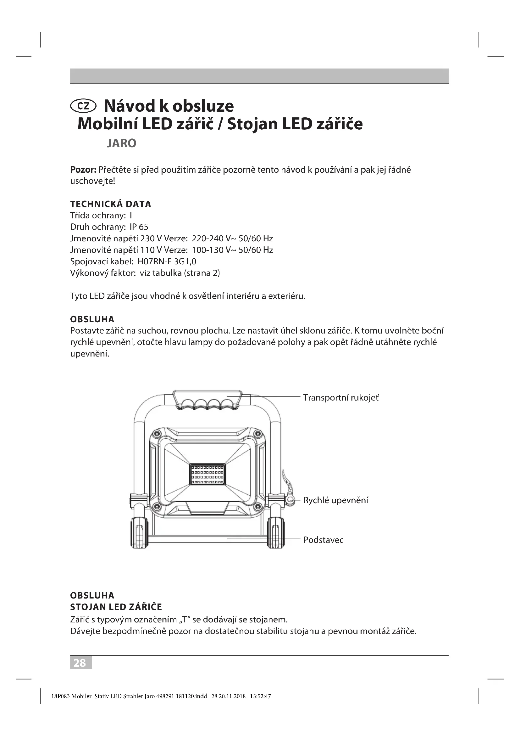 Deklaracja zgodności jest zdeponowana u producenta. Adresy Hugo Brennenstuhl GmbH & Co. KG Seestraße 1 – 3 · D-72074 Tübingen H. Brennenstuhl S.A.S. 4 rue de Bruxelles ∙ F-67170 Bernolsheim lectra-t ag Blegistrasse 13 · CH-6340 Baar www.brennenstuhl.com 18P083 Mobiler_Stativ LED Strahler Jaro 498291 181120.indd 27 20.11.2018 13:52:4628 B Návod k obsluze Mobilní LED zářič / Stojan LED zářiče JARO Pozor: Přečtěte si před použitím zářiče pozorně tento návod k používání a pak jej řádně uschovejte! TECHNICKÁ DATA Třída ochrany: I Druh ochrany: IP 65 Jmenovité napětí 230 V Verze: 220-240 V~ 50/60 Hz Jmenovité napětí 110 V Verze: 100-130 V~ 50/60 Hz Spojovací kabel: H07RN-F 3G1,0 Výkonový faktor: viz tabulka (strana 2) Tyto LED zářiče jsou vhodné k osvětlení interiéru a exteriéru. OBSLUHA Postavte zářič na suchou, rovnou plochu. Lze nastavit úhel sklonu zářiče. K tomu uvolněte boční rychlé upevnění, otočte hlavu lampy do požadované polohy a pak opět řádně utáhněte rychlé upevnění. Rychlé upevnění Podstavec Transportní rukojeť OBSLUHA