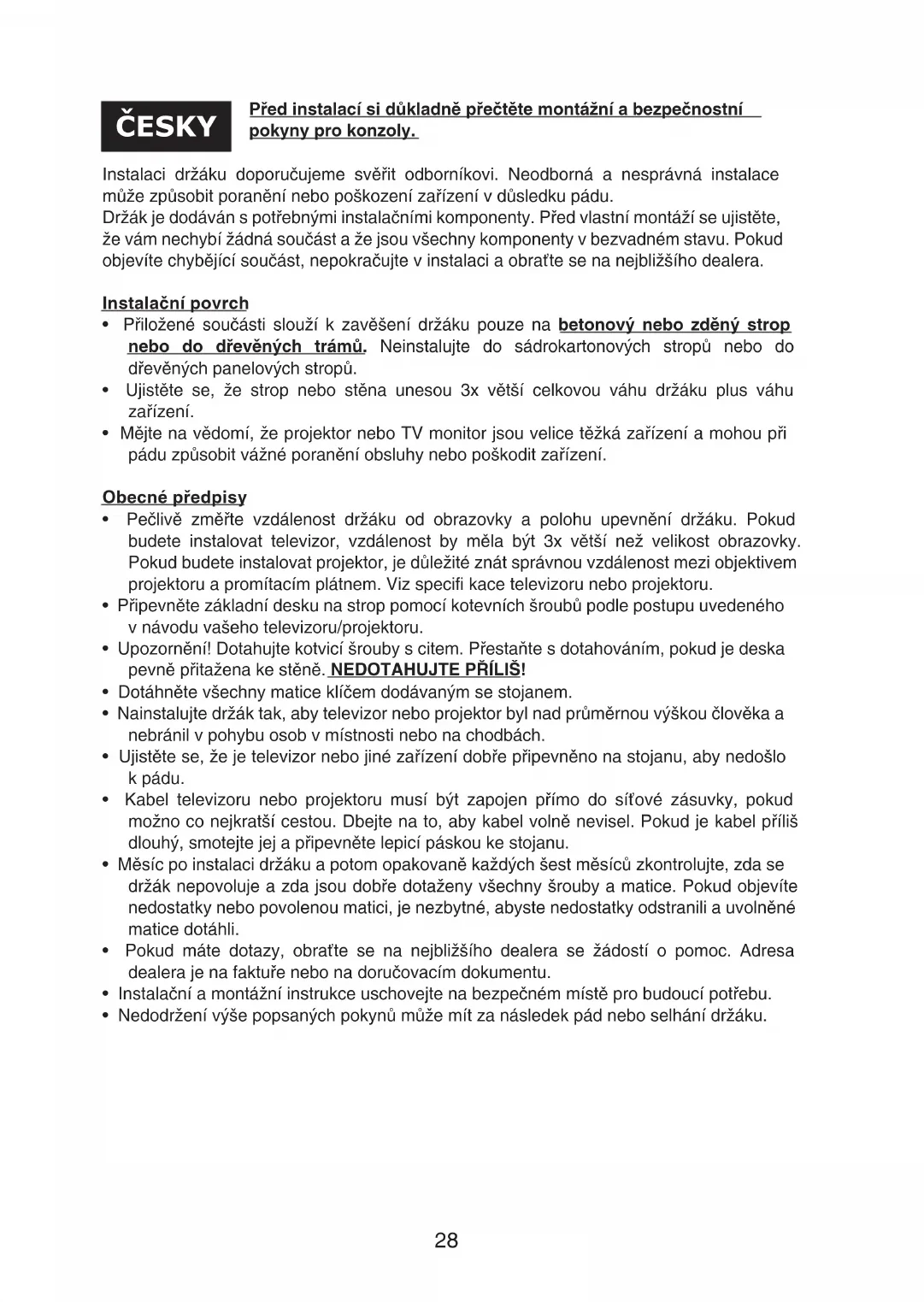 - Mějte na vědomí, že projektor nebo TV monitor jsou velice těžká zařízení a mohou při pádu způsobit vážné poranění obsluhy nebo poškodit zařízení. Obecné předpisy