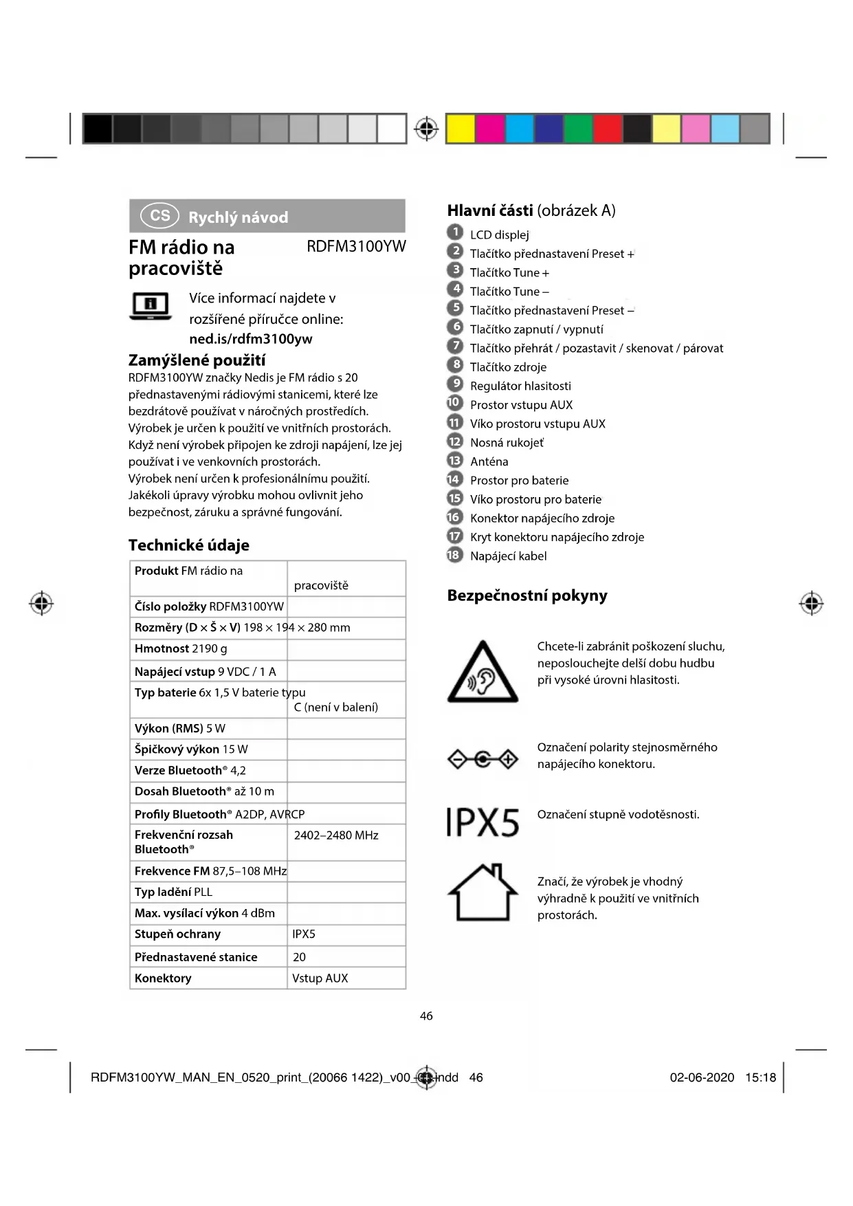 Rychlý návod FM rádio na pracoviště RDFM3100YW Více informací najdete v rozšířené příručce online: ned.is/rdfm3100yw Zamýšlené použití RDFM3100YW značky Nedis je FM rádio s20 přednastavenými rádiovými stanicemi, které lze bezdrátově používat vnáročných prostředích. Výrobek je určen kpoužití ve vnitřních prostorách. Když není výrobek připojen ke zdroji napájení, lze jej používat ive venkovních prostorách. Výrobek není určen k profesionálnímu použití. Jakékoli úpravy výrobku mohou ovlivnit jeho bezpečnost, záruku a správné fungování. Technické údaje Produkt FM rádio na pracoviště Číslo položky RDFM3100YW Rozměry (D × Š × V) 198 × 194 × 280mm Hmotnost 2190 g Napájecí vstup 9 VDC / 1 A Typ baterie 6x 1,5 V baterie typu C (není v balení) Výkon (RMS) 5 W Špičkový výkon 15 W Verze Bluetooth® 4,2 Dosah Bluetooth® až 10 m Proly Bluetooth® A2DP, AVRCP Frekvenční rozsah Bluetooth® 2402–2480MHz Frekvence FM 87,5–108MHz Typ ladění PLL Max. vysílací výkon 4 dBm Stupeň ochrany IPX5 Přednastavené stanice 20 Konektory Vstup AUX RDFM3100YW_MAN_EN_0520_print_(20066 1422)_v00_03.indd 46RDFM3100YW_MAN_EN_0520_print_(20066 1422)_v00_03.indd 46 02-06-2020 15:1802-06-2020 15:1847