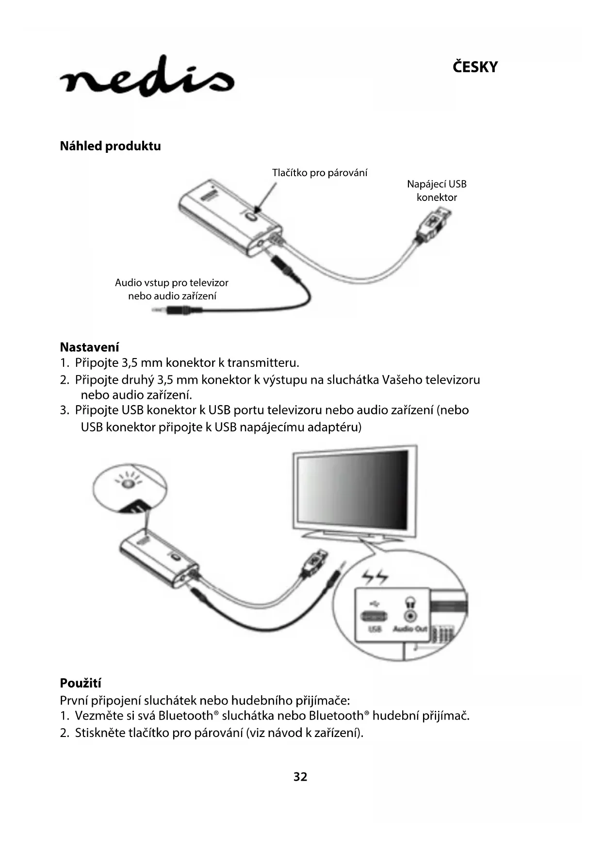 Náhled produktu Tlačítko pro párování Napájecí USB konektor Audio vstup pro televizor nebo audio zařízení Nastavení