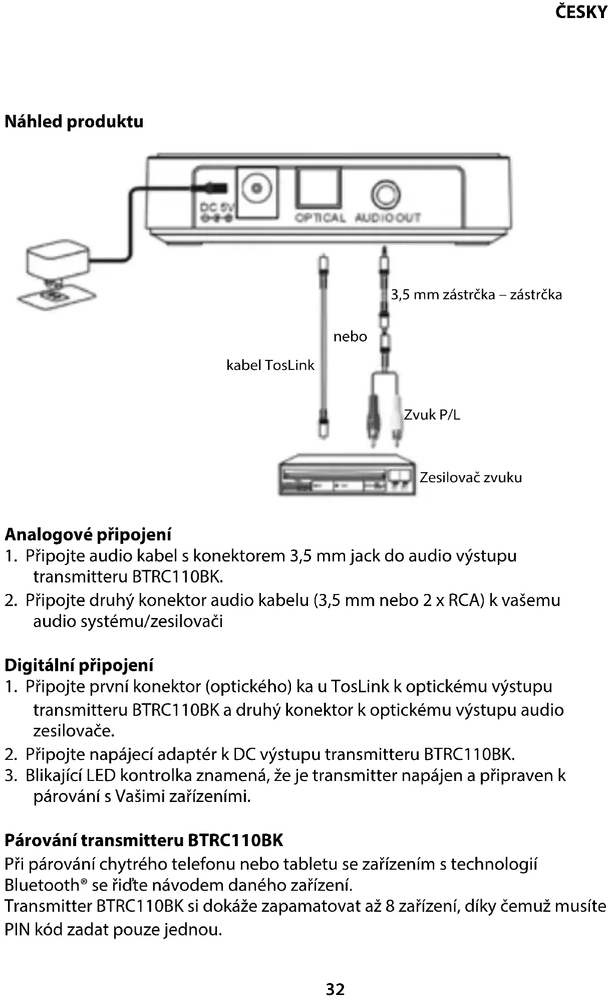 BTRC110BK“. LED indikace Indikace Význam Popis Blikání každých 5sekund Párování Hledání zařízení v režimu párování/ čekání pro připojení Nepřetržité svícení Připojeno Transmitter BTRC110BK a zařízení jsou propojeny Řešení problémů Pokud se reproduktorů neozývá žádný zvuk, proveďte následující: - Ujistěte se, že je transmitter BTRC110BK napájený; - Ujistěte se, že audio kabel je k transmitteru BTRC110BK správně připojený; - Ujistěte se, že audio zdroj vašeho zesilovače pracuje správně; - Ujistěte se, že je hlasitost dostatečně vysoká; - Ujistěte se, že zařízení je vzdáleno maximálně 10metrů od audio transmitteru; - Ujistěte se, že je na Vašem zařízení aktivována funkce Bluetooth®; - Ujistěte se, že vaše zařízení přehrává hudbu.ČESKY