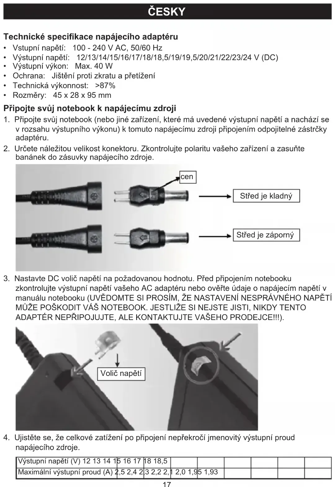 zkontrolujte výstupní napětí vašeho AC adaptéru nebo ověřte údaje o napájecím napětí v manuálu notebooku (UVĚDOMTE SI PROSÍM, ŽE NASTAVENÍ NESPRÁVNÉHO NAPĚTÍ MŮŽE POŠKODIT VÁŠ NOTEBOOK. JESTLIŽE SI NEJSTE JISTI, NIKDY TENTO ADAPTÉR NEPŘIPOJUJTE, ALE KONTAKTUJTE VAŠEHO PRODEJCE!!!). Volič napětí