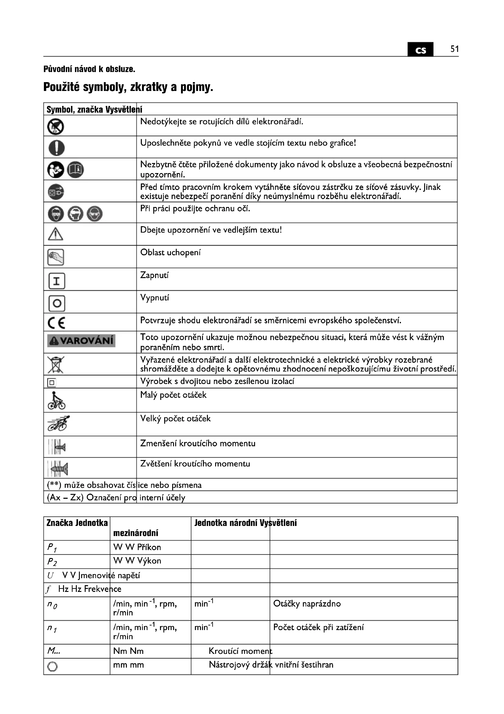 Původní návod k obsluze. Použité symboly, zkratky a pojmy. Symbol, značka Vysvětlení Nedotýkejte se rotujících dílů elektronářadí. Uposlechněte pokynů ve vedle stojícím textu nebo grafice! Nezbytně čtěte přiložené dokumenty jako návod k obsluze a všeobecná bezpečnostní upozornění. Před tímto pracovním krokem vytáhněte síťovou zástrčku ze síťové zásuvky. Jinak existuje nebezpečí poranění díky neúmyslnému rozběhu elektronářadí. Při práci použijte ochranu očí. Dbejte upozornění ve vedlejším textu! Oblast uchopení Zapnutí Vypnutí Potvrzuje shodu elektronářadí se směrnicemi evropského společenství. Toto upozornění ukazuje možnou nebezpečnou situaci, která může vést k vážným poraněním nebo smrti. Vyřazené elektronářadí a další elektrotechnické a elektrické výrobky rozebrané shromážděte a dodejte k opětovnému zhodnocení nepoškozujícímu životní prostředí. Výrobek s dvojitou nebo zesílenou izolací Malý počet otáček Velký počet otáček Zmenšení kroutícího momentu Zvětšení kroutícího momentu (**) může obsahovat číslice nebo písmena (Ax – Zx) Označení pro interní účely Značka Jednotka mezinárodní Jednotka národní Vysvětlení