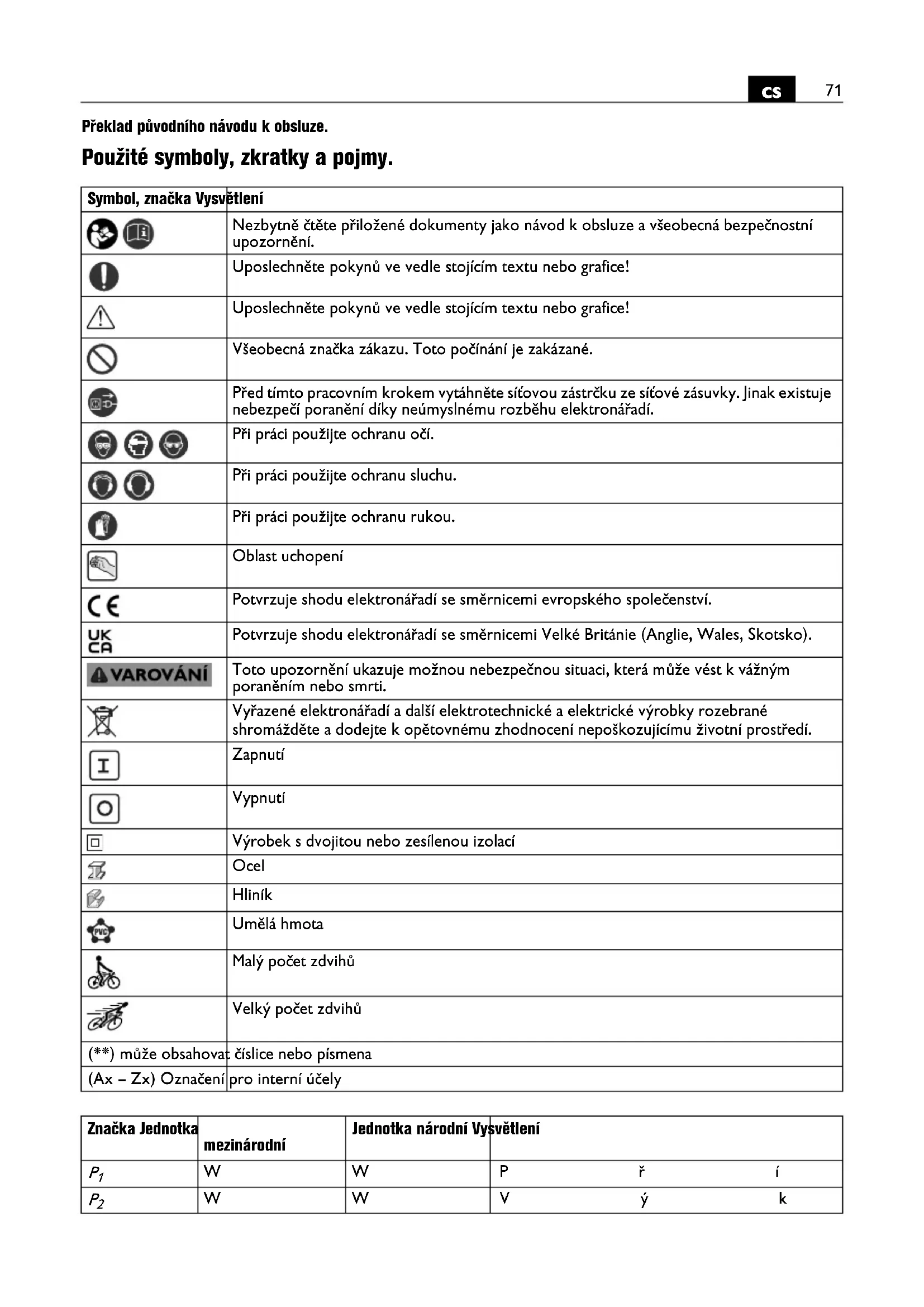 Překlad původního návodu k obsluze. Použité symboly, zkratky a pojmy. Symbol, značka Vysvětlení Nezbytně čtěte přiložené dokumenty jako návod k obsluze a všeobecná bezpečnostní upozornění. Uposlechněte pokynů ve vedle stojícím textu nebo grafice! Uposlechněte pokynů ve vedle stojícím textu nebo grafice! Všeobecná značka zákazu. Toto počínání je zakázané. Před tímto pracovním krokem vytáhněte síťovou zástrčku ze síťové zásuvky. Jinak existuje nebezpečí poranění díky neúmyslnému rozběhu elektronářadí. Při práci použijte ochranu očí. Při práci použijte ochranu sluchu. Při práci použijte ochranu rukou. Oblast uchopení Potvrzuje shodu elektronářadí se směrnicemi evropského společenství. Potvrzuje shodu elektronářadí se směrnicemi Velké Británie (Anglie, Wales, Skotsko). Toto upozornění ukazuje možnou nebezpečnou situaci, která může vést k vážným poraněním nebo smrti. Vyřazené elektronářadí a další elektrotechnické a elektrické výrobky rozebrané shromážděte a dodejte k opětovnému zhodnocení nepoškozujícímu životní prostředí. Zapnutí Vypnutí Výrobek s dvojitou nebo zesílenou izolací Ocel Hliník Umělá hmota Malý počet zdvihů Velký počet zdvihů (**) může obsahovat číslice nebo písmena (Ax – Zx) Označení pro interní účely Značka Jednotka mezinárodní Jednotka národní Vysvětlení