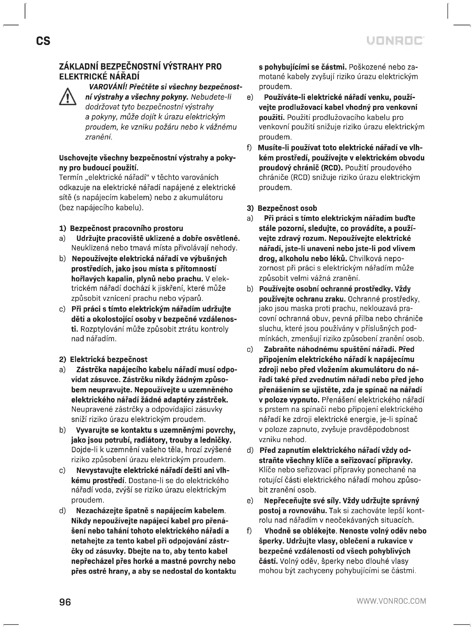Poškozená a likvidovaná elektrická nebo elektronická zařízení musí být odevzdána ve sběrných dvorech, které jsou určeny pro tento účel. Pouze pro země EU Nevyhazujte elektrická nářadí do běžného domácí- ho odpadu. Podle evropské směrnice 2012/19/EU týkající se likvidace elektrických a elektronických zařízení a její implementace do vnitrostátního práva, musí být nepoužívaná elektrická nářadí shromažďována odděleně a jejich likvidace musí být provedena tak, aby nedošlo k ohrožení životního prostředí. ZÁRUKA Výrobky VONROC jsou vyvíjeny v souladu s poža- davky norem na nejvyšší kvalitu a je zaručeno, že po dobu platné záruky, která začíná běžet dnem původního nákupu, nebudou na těchto výrobcích žádné vady materiálu, ani vady způsobené špatným dílenským zpracováním. Dojde-li během tohoto období k závadě v důsledku vady materiálu nebo dílenského zpracování, kontaktujte přímo firmu VONROC. Z této záruky jsou vyloučeny následující případy: