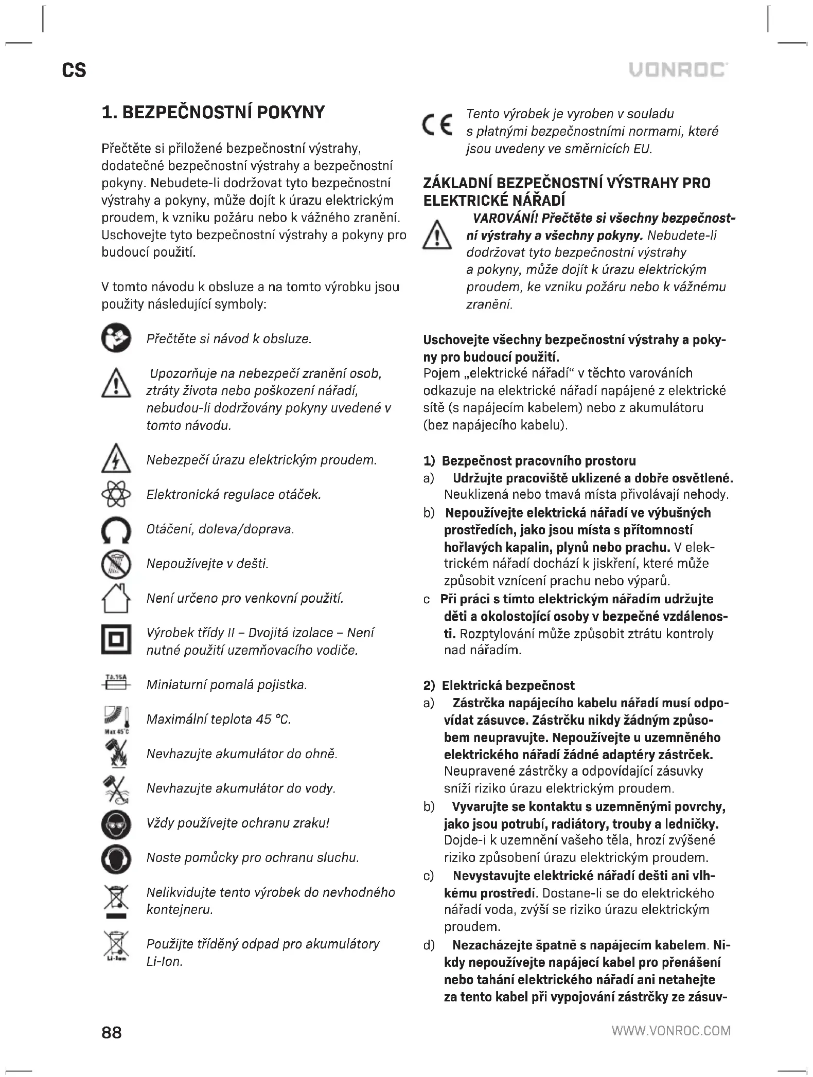 TORY a) Akumulátor nerozebírejte. Nebezpečí zkratu. b) Chraňte akumulátor před teplem, např. před nepřetržitým intenzivním slunečním světlem, ohněm, vodou a vlhkostí. Nebezpečí výbuchu. c) V případě poškození a nesprávného použití akumulátoru se mohou uvolňovat výpary. Vpřípadě potíží vyvětrejte místnost a vyhle- dejte lékařskou pomoc. Výpary mohou dráždit dýchací ústrojí. d) Používejte tento akumulátor výhradně s vaším výrobkem značky Vonroc. Toto opatření samo o sobě chrání akumulátor před nebezpečným přetížením. e) Akumulátor může být poškozen ostrými před- měty, jako například hřebíky nebo šroubováky, nebo vnější silou. Může dojít k vnitřnímu zkratu a vznícení, vzniku kouře, výbuchu nebo přehřátí akumulátoru. BEZPEČNOSTNÍ VAROVÁNÍ PRO NABÍJEČKU Zamýšlené použití Touto nabíječkou nabíjejte výhradně akumulátorové moduly typu CD801AA a CD803AA. Ostatní typy akumulátorů mohou prasknout a způsobit zranění a poškození. a) Tento výrobek není určen k použití osobami (včetně dětí) se sníženými fyzickými, smys- lovými nebo duševními schopnostmi, nebo s nedostatkem zkušeností a znalostí, pokud jim nebyl stanoven dohled nebo pokud jim nebyly poskytnuty potřebné instrukce. b) Děti musí být pod dozorem, aby si s tímto zaří- zením nehrály. c) Nenabíjejte baterie, které nejsou k nabíjení určeny! d) Během nabíjení musí být akumulátory umístěny na dobře větraném místě! Elektrická bezpečnost Vždy zkontrolujte, zda se napájecí napětí sítě shoduje s napájecím napětím na výkonovém štítku.