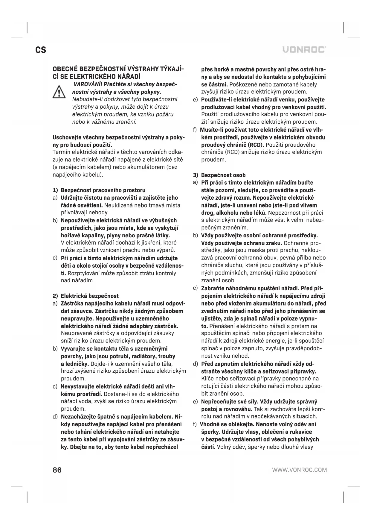 Poškozená alikvidovaná elektrická nebo elektronická zařízení musí být odevzdána ve sběrných dvorech, které jsou určeny pro tento účel. Pouze pro země EU Nevyhazujte elektrická nářadí do běžného domá- cího odpadu. Podle evropské směrnice 2012/19/ EC týkající se likvidace elektrických aelektronic- kých zařízení ajejí implementace do vnitrostátního práva, musí být nepoužívaná elektrická nářadí shromažďována odděleně ajejich likvidace musí být provedena tak, aby nedošlo kohrožení životního prostředí. ZÁRUKA Výrobky VONROC jsou vyvíjeny vsouladu spoža- davky norem na nejvyšší kvalitu aje zaručeno, že po dobu platné záruky, která začíná běžet dnem původního nákupu, nebudou na těchto výrobcích žádné vady materiálu, ani vady způsobené špatným dílenským zpracováním. Dojde-li během tohoto období kzávadě vdůsledku vady materiálu nebo dílenského zpracování, kontaktujte přímo firmu VONROC. Ztéto záruky jsou vyloučeny následující případy: