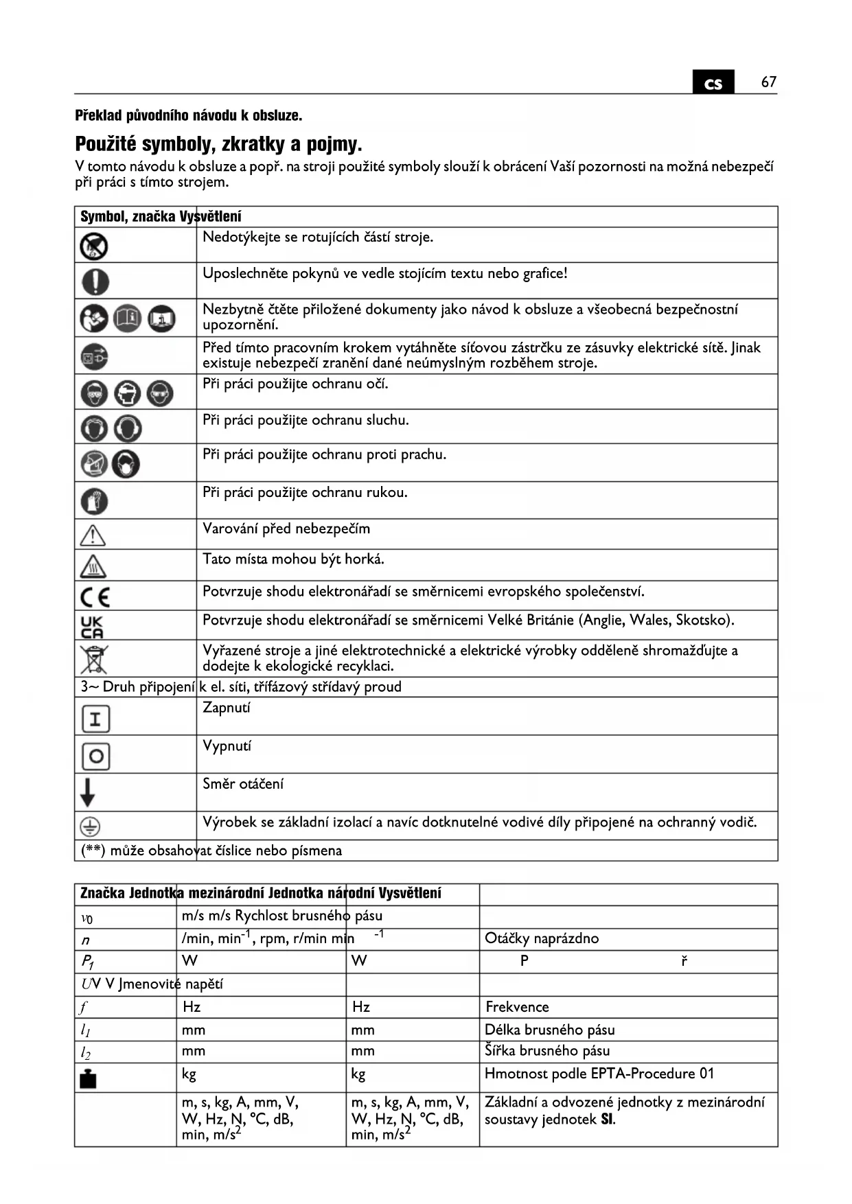 Překlad původního návodu k obsluze. Použité symboly, zkratky a pojmy. V tomto návodu k obsluze a popř. na stroji použité symboly slouží k obrácení Vaší pozornosti na možná nebezpečí při práci s tímto strojem. Symbol, značka Vysvětlení Nedotýkejte se rotujících částí stroje. Uposlechněte pokynů ve vedle stojícím textu nebo grafice! Nezbytně čtěte přiložené dokumenty jako návod k obsluze a všeobecná bezpečnostní upozornění. Před tímto pracovním krokem vytáhněte síťovou zástrčku ze zásuvky elektrické sítě. Jinak existuje nebezpečí zranění dané neúmyslným rozběhem stroje. Při práci použijte ochranu očí. Při práci použijte ochranu sluchu. Při práci použijte ochranu proti prachu. Při práci použijte ochranu rukou. Varování před nebezpečím Tato místa mohou být horká. Potvrzuje shodu elektronářadí se směrnicemi evropského společenství. Potvrzuje shodu elektronářadí se směrnicemi Velké Británie (Anglie, Wales, Skotsko). Vyřazené stroje a jiné elektrotechnické a elektrické výrobky odděleně shromažďujte a dodejte k ekologické recyklaci. 3~ Druh připojení k el. síti, třífázový střídavý proud Zapnutí Vypnutí Směr otáčení Výrobek se základní izolací a navíc dotknutelné vodivé díly připojené na ochranný vodič. (**) může obsahovat číslice nebo písmena Značka Jednotka mezinárodní Jednotka národní Vysvětlení