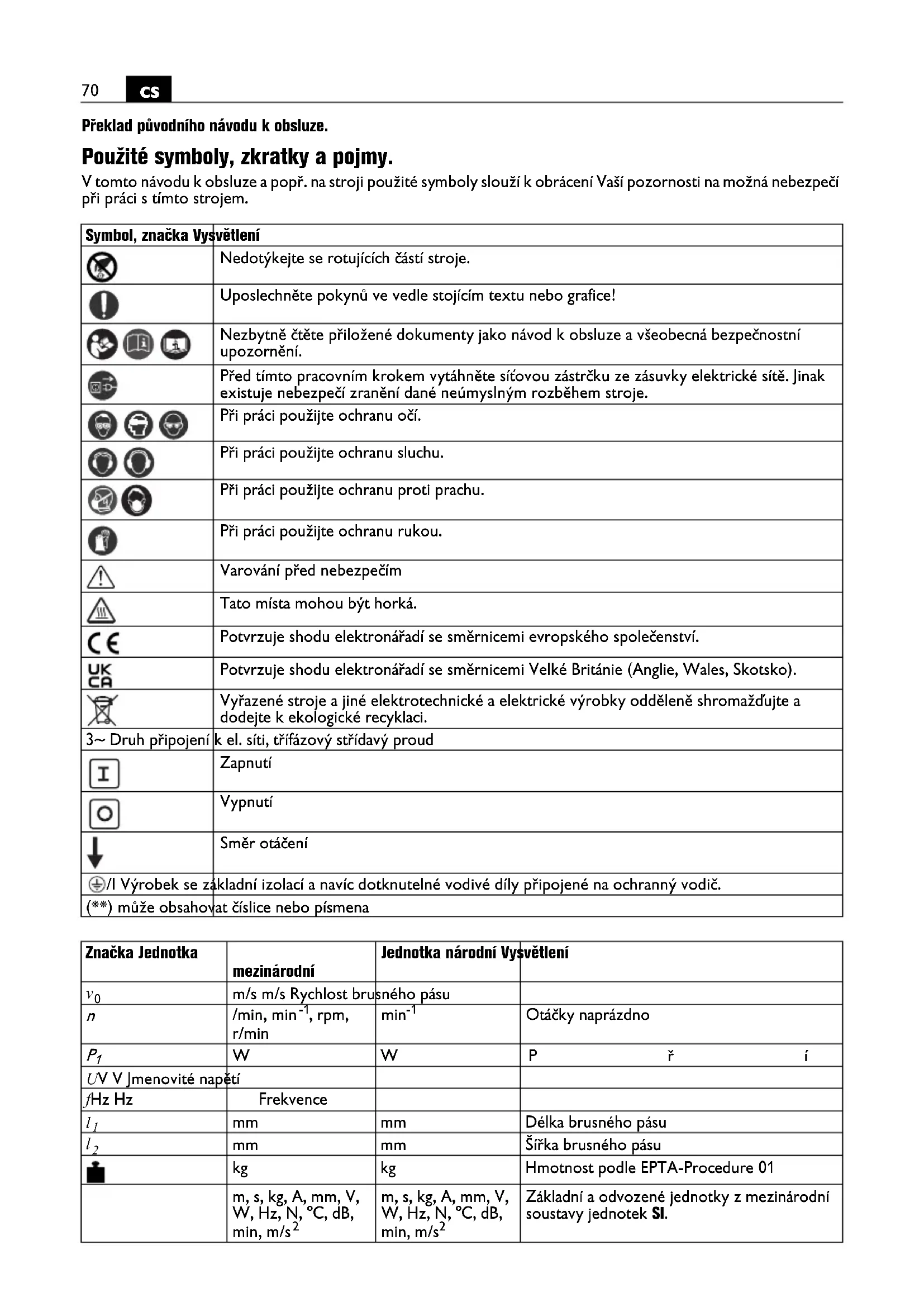 Překlad původního návodu k obsluze. Použité symboly, zkratky a pojmy. V tomto návodu k obsluze a popř. na stroji použité symboly slouží k obrácení Vaší pozornosti na možná nebezpečí při práci s tímto strojem. Symbol, značka Vysvětlení Nedotýkejte se rotujících částí stroje. Uposlechněte pokynů ve vedle stojícím textu nebo grafice! Nezbytně čtěte přiložené dokumenty jako návod k obsluze a všeobecná bezpečnostní upozornění. Před tímto pracovním krokem vytáhněte síťovou zástrčku ze zásuvky elektrické sítě. Jinak existuje nebezpečí zranění dané neúmyslným rozběhem stroje. Při práci použijte ochranu očí. Při práci použijte ochranu sluchu. Při práci použijte ochranu proti prachu. Při práci použijte ochranu rukou. Varování před nebezpečím Tato místa mohou být horká. Potvrzuje shodu elektronářadí se směrnicemi evropského společenství. Potvrzuje shodu elektronářadí se směrnicemi Velké Británie (Anglie, Wales, Skotsko). Vyřazené stroje a jiné elektrotechnické a elektrické výrobky odděleně shromažďujte a dodejte k ekologické recyklaci. 3~ Druh připojení k el. síti, třífázový střídavý proud Zapnutí Vypnutí Směr otáčení /I Výrobek se základní izolací a navíc dotknutelné vodivé díly připojené na ochranný vodič. (**) může obsahovat číslice nebo písmena Značka Jednotka mezinárodní Jednotka národní Vysvětlení