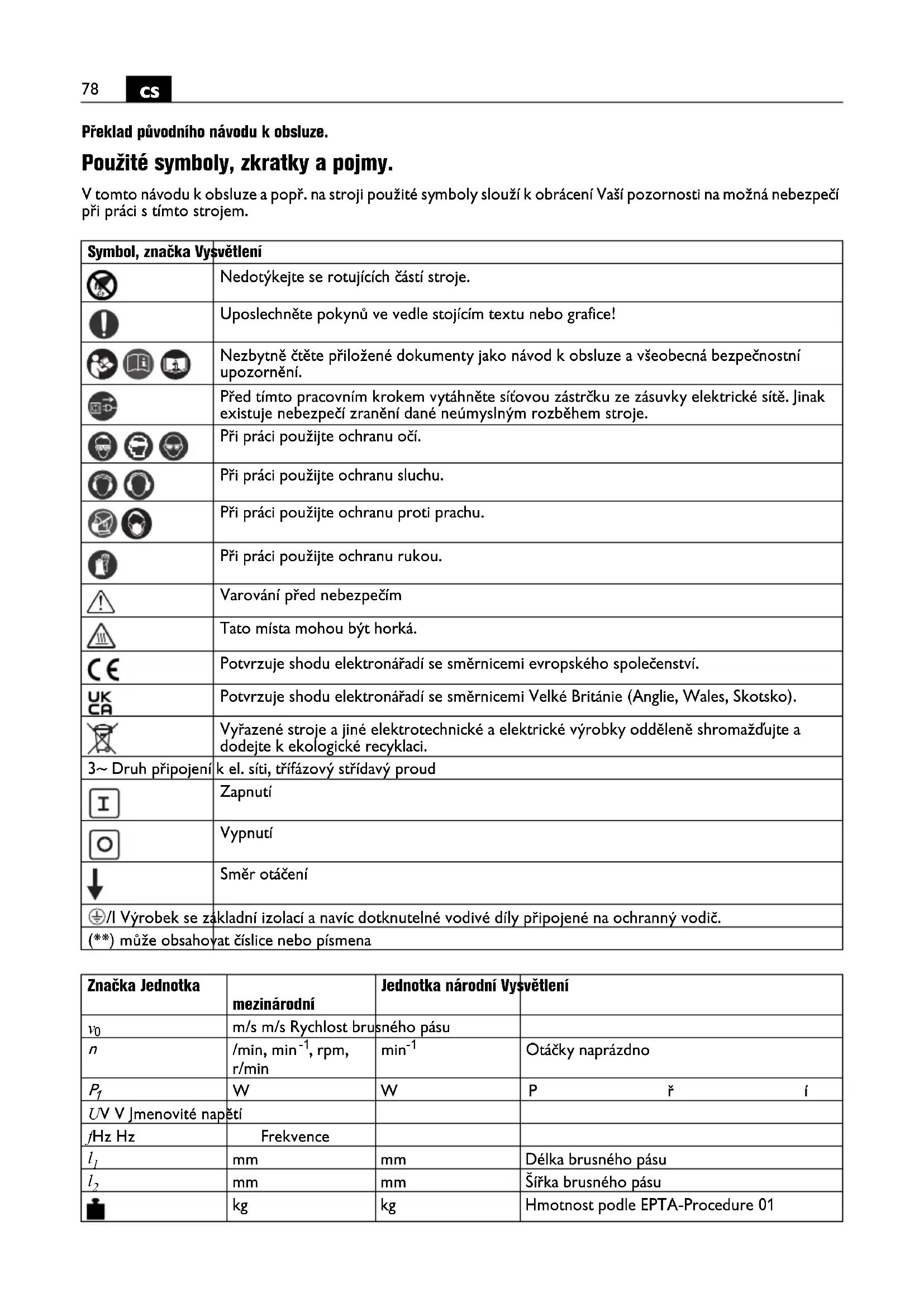 Překlad původního návodu k obsluze. Použité symboly, zkratky a pojmy. V tomto návodu k obsluze a popř. na stroji použité symboly slouží k obrácení Vaší pozornosti na možná nebezpečí při práci s tímto strojem. Symbol, značka Vysvětlení Nedotýkejte se rotujících částí stroje. Uposlechněte pokynů ve vedle stojícím textu nebo grafice! Nezbytně čtěte přiložené dokumenty jako návod k obsluze a všeobecná bezpečnostní upozornění. Před tímto pracovním krokem vytáhněte síťovou zástrčku ze zásuvky elektrické sítě. Jinak existuje nebezpečí zranění dané neúmyslným rozběhem stroje. Při práci použijte ochranu očí. Při práci použijte ochranu sluchu. Při práci použijte ochranu proti prachu. Při práci použijte ochranu rukou. Varování před nebezpečím Tato místa mohou být horká. Potvrzuje shodu elektronářadí se směrnicemi evropského společenství. Potvrzuje shodu elektronářadí se směrnicemi Velké Británie (Anglie, Wales, Skotsko). Vyřazené stroje a jiné elektrotechnické a elektrické výrobky odděleně shromažďujte a dodejte k ekologické recyklaci. 3~ Druh připojení k el. síti, třífázový střídavý proud Zapnutí Vypnutí Směr otáčení /I Výrobek se základní izolací a navíc dotknutelné vodivé díly připojené na ochranný vodič. (**) může obsahovat číslice nebo písmena Značka Jednotka mezinárodní Jednotka národní Vysvětlení