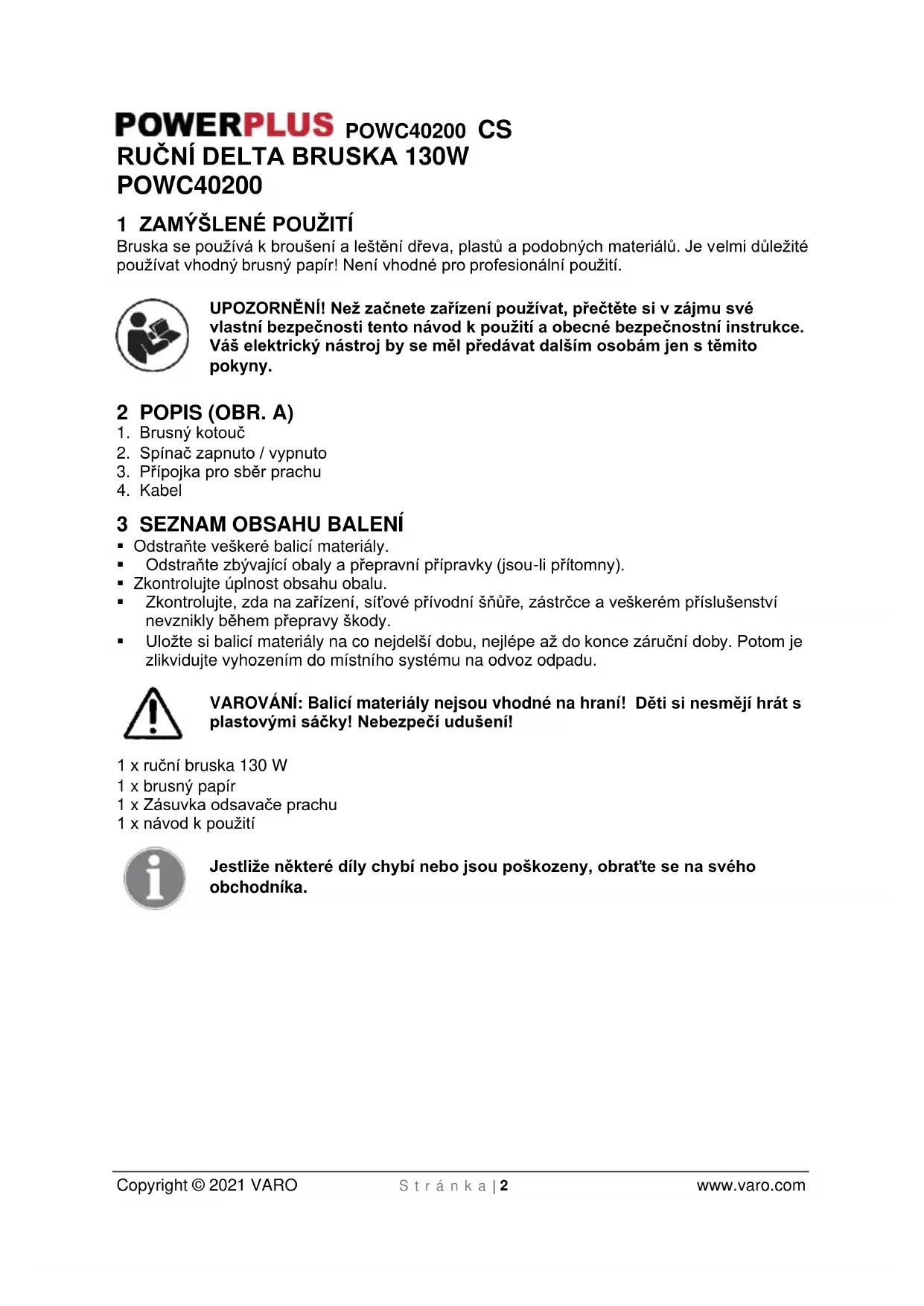 UPOZORNENI! Než začnete zarizení používat, prěctěte si v zájmu své vlastné bezpečnosti tento námod k použítá obecné bezpečnosti instrukce. Vás elektrický nástroj by se měl prědávat dalsím osobámjen s temito pokyny.