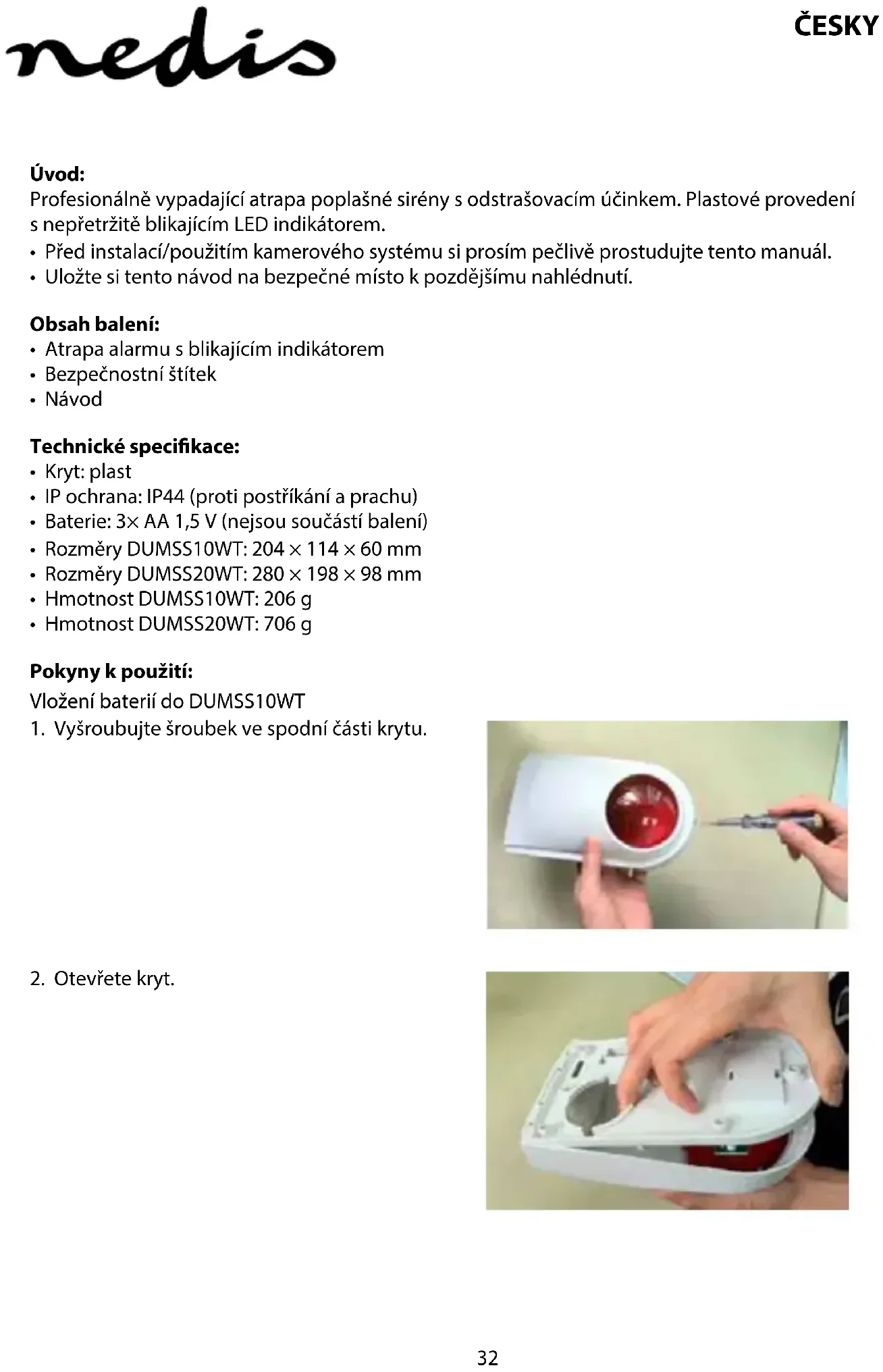 - Pro více informací se obraťte na prodejce nebo místní orgány odpovědné za nakládání s odpady. Tento produkt byl vyroben a je dodáván v souladu se všemi příslušnými nařízeními a směrnicemi platnými ve všech členských státech Evropské Unie. Splňuje také veškeré relevantní specikace a předpisy státu, ve kterém se prodává. Ociální dokumentaci lze získat na vyžádání. Patří sem např: Prohlášení o shodě (a identikace produktu), materiálový bezpečnostní list, zpráva o testování produktu. V případě dotazů kontaktujte naše oddělení služeb zákazníkům: Webové stránky: http://www.nedis.com/en-us/contact/contact-form.htm E-mail: service@nedis.com Telefon: +31 (0)73-5991055 (během otevírací doby) NEDIS B.V., De Tweeling 28, 5215 MC ’s-Hertogenbosch, NIZOZEMSKO35 ROMÂNĂ Introducere: Alarmă falsă cu aspect profesional şi cu efect de îndepărtare. Realizată dintr-o carcasă de plastic şi dotată cu un indicator LED cu aprindere intermitentă permanentă.