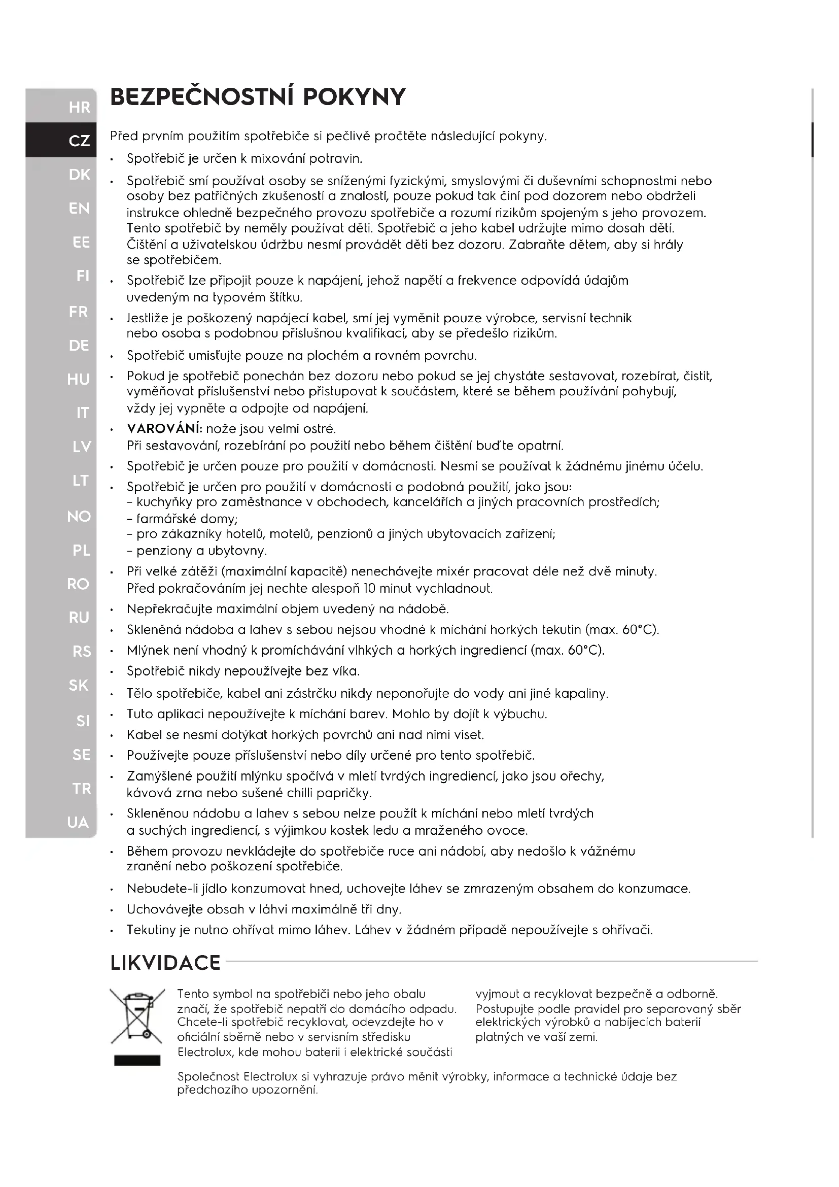 Spotřebič je určen k mixování potravin. Spotřebič smí používat osoby se sníženými fyzickými, smyslovými či duševními schopnostmi nebo osoby bez patřičných zkušeností a znalostí, pouze pokud tak činí pod dozorem nebo obdrželi instrukce ohledně bezpečného provozu spotřebiče a rozumí rizikům spojeným s jeho provozem. Tento spotřebič by neměly používat děti. Spotřebič a jeho kabel udržujte mimo dosah dětí. Čištění a uživatelskou údržbu nesmí provádět děti bez dozoru. Zabraňte dětem, aby si hrály se spotřebičem. Spotřebič lze připojit pouze k napájení, jehož napětí a frekvence odpovídá údajům uvedeným na typovém štítku. Jestliže je poškozený napájecí kabel, smí jej vyměnit pouze výrobce, servisní technik nebo osoba s podobnou příslušnou kvalif ikací, aby se předešlo rizikům. Spotřebič umisťujte pouze na plochém a rovném povrchu. Pokud je spotřebič ponechán bez dozoru nebo pokud se jej chystáte sestavovat, rozebírat, čistit, vyměňovat příslušenství nebo přistupovat k součástem, které se během používání pohybují, vždy jej vypněte a odpojte od napájení. VAROVÁNÍ: nože jsou velmi ostré. Při sestavování, rozebírání po použití nebo během čištění buďte opatrní. Spotřebič je určen pouze pro použití v domácnosti. Nesmí se používat k žádnému jinému účelu. Spotřebič je určen pro použití v domácnosti a podobná použití, jako jsou: – kuchyňky pro zaměstnance v obchodech, kancelářích a jiných pracovních prostředích; – farmářské domy; – pro zákazníky hotelů, motelů, penzionů a jiných ubytovacích zařízení; – penziony a ubytovny. Při velké zátěži (maximální kapacitě) nenechávejte mixér pracovat déle než dvě minuty. Před pokračováním jej nechte alespoň 10 minut vychladnout. Nepřekračujte maximální objem uvedený na nádobě. Skleněná nádoba a lahev s sebou nejsou vhodné k míchání horkých tekutin (max. 60°C). Mlýnek není vhodný k promíchávání vlhkých a horkých ingrediencí (max. 60°C). Spotřebič nikdy nepoužívejte bez víka. Tělo spotřebiče, kabel ani zástrčku nikdy neponořujte do vody ani jiné kapaliny. Tuto aplikaci nepoužívejte k míchání barev. Mohlo by dojít k výbuchu. Kabel se nesmí dotýkat horkých povrchů ani nad nimi viset. Používejte pouze příslušenství nebo díly určené pro tento spotřebič. Zamýšlené použití mlýnku spočívá v mletí tvrdých ingrediencí, jako jsou ořechy, kávová zrna nebo sušené chilli papričky. Skleněnou nádobu a lahev s sebou nelze použít k míchání nebo mletí tvrdých a suchých ingrediencí, s výjimkou kostek ledu a mraženého ovoce. Během provozu nevkládejte do spotřebiče ruce ani nádobí, aby nedošlo k vážnému zranění nebo poškození spotřebiče. Nebudete-li jídlo konzumovat hned, uchovejte láhev se zmrazeným obsahem do konzumace. Uchovávejte obsah v láhvi maximálně tři dny. Tekutiny je nutno ohřívat mimo láhev. Láhev v žádném případě nepoužívejte s ohřívači. LIKVIDACE Společnost Electrolux si vyhrazuje právo měnit výrobky, informace a technické údaje bez předchozího upozornění. Tento symbol na spotřebiči nebo jeho obalu značí, že spotřebič nepatří do domácího odpadu. Chcete-li spotřebič recyklovat, odevzdejte ho v oficiální sběrně nebo v servisním středisku Electrolux, kde mohou baterii i elektrické součásti vyjmout a recyklovat bezpečně a odborně. Postupujte podle pravidel pro separovaný sběr elektrických výrobků a nabíjecích baterií platných ve vaší zemi.HR