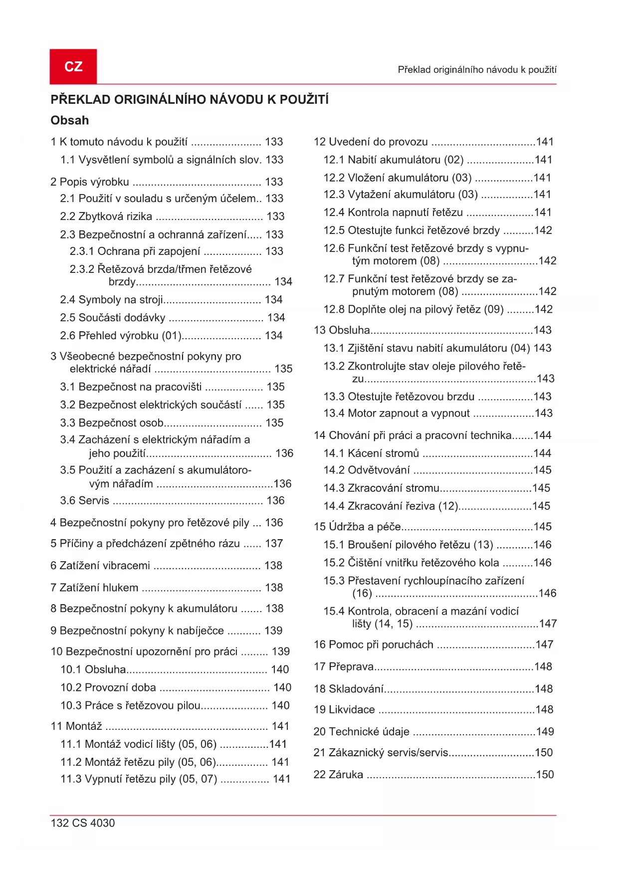 Ve sběrných zařízeních výrobce (pokud je členem společného systému zpětného odbě- ru) Tato prohlášení platí pouze pro baterie a akumu- látory, které se prodávají v zemích Evropské unie a podléhají evropské právní směrnici 2006/66/ ES. V zemích mimo Evropskou unii mohou platit odlišná ustanovení o likvidaci baterií a akumulá- torů. 20 TECHNICKÉ ÚDAJE Typ CS 4030 Č. výrobku 113616 rychlost na volnoběh 17m/s provozní rychlost 16m/s ± 0,7m/s Délka vodicí lišty cca 350mm Užitečná délka pily 265mm Řetěz 91P045X Tloušťka pohonných členů 1,27mm Dělení - řetězové kolo 3/8“ Řetězová brzda Ano (elektrická, PCB a brz- dová tyč) Doba doběhu řetězu (ČSN EN 60745-2-13 – 19.107.1) max. 0,15s Doba doběhu řetězu (ČSN EN 60745-2-13 – 19.113) max. 2s Aktivace řetězu dvojnásobně Objem olejové nádrže řetězu 180ml Hmotnost s vodicí lištou a pilovým řetězem 4,45kg Hmotnost bez vodicí lišty a pilového řetězu 3,9kg Ochrana proti přetížení Ne Hladina akustického výkonu LwA (ČSN EN ISO 3744) 101dB(A) Hladina akustického tlaku LpA (ČSN EN ISO 3744) 91,5 dB(A), K = ±3dB(A)CZ 150 CS 4030 Zákaznický servis/servis Typ CS 4030 Hodnota vibrací (ČSN EN 28662-1) 3,159m/s