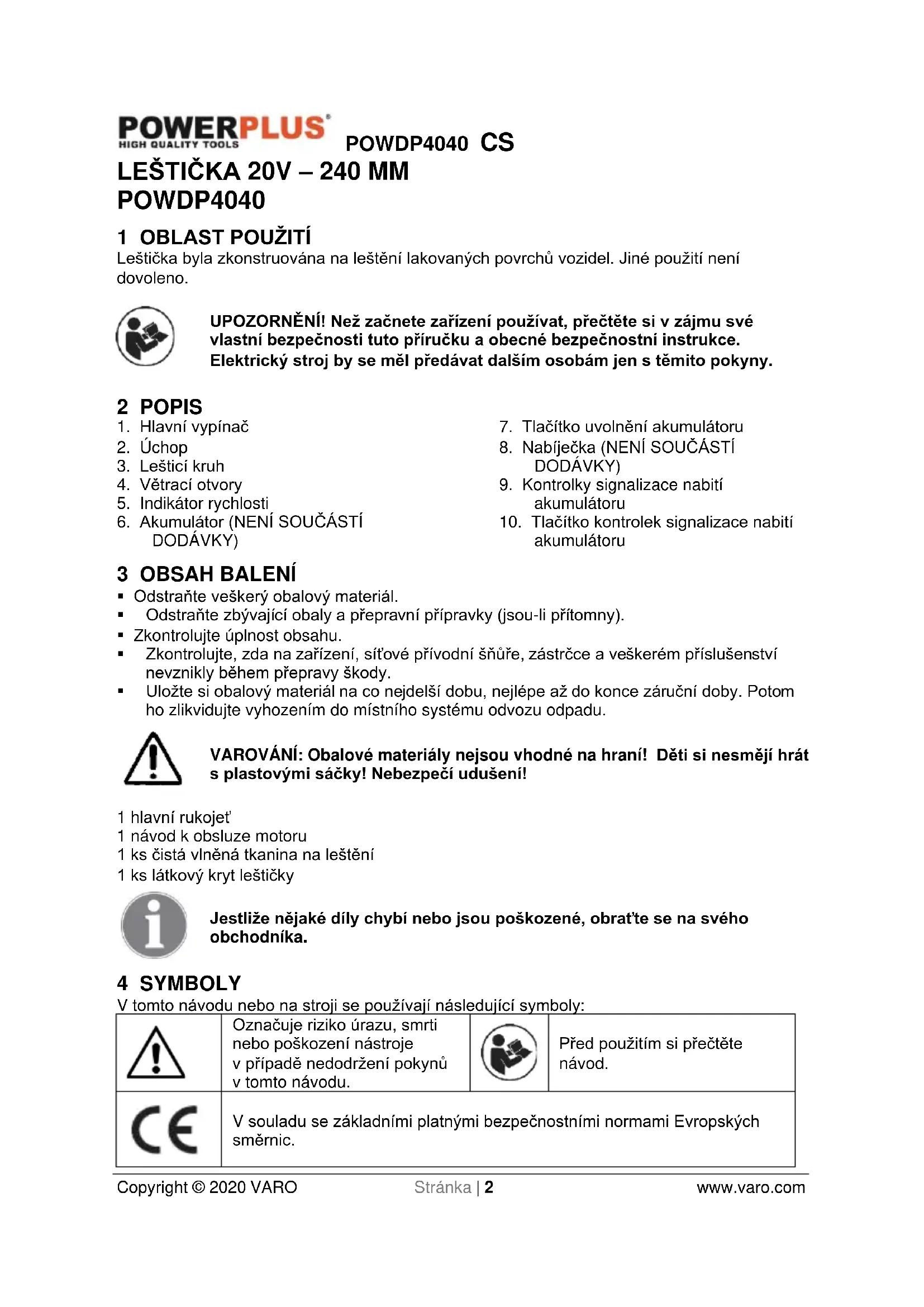 - VARO – Vic. Van Rompuy N.V. - Joseph Van Instraat 9 - BE2500 Lier - BELGIUM, prohlašuje, že Typ zařízení: Leštička Značka: POWERplus Číslo položky: POWDP4040 je ve shodě se základními požadavky a ostatními relevantními ustanoveními příslušných evropských směrnic založených na aplikaci evropských harmonizovaných norem. Jakákoliv neschválená úprava přístroje vede ke ztrátě platnosti tohoto prohlášení. Evropské směrnice (včetně, nastanou-li, jejich změn a doplňků až do data podpisu): 2011/65/EU 2006/42/ES 2014/30/EU Evropské harmonizované normy (včetně, nastanou-li, jejich změn a doplňků až do data podpisu): EN62841-1 : 2015 EN62841-2-4 : 2014* EN55014-1 : 2017 EN55014-2 : 2015 Držitel technické dokumentace: Philippe Vankerkhove, VARO - Vic. Van Rompuy N.V. Níže podepsaný jedná jménem vedení společnosti: Ludo Mertens Regulativní postupy – Manažer pro dohled nad řádným jednáním 12/08/2020, Lier - BelgiumPOWDP4040 SK Copyright © 2020 VARO S t r a n a | 1 www.varo.com 1 POUŽÍVANIE p. 2