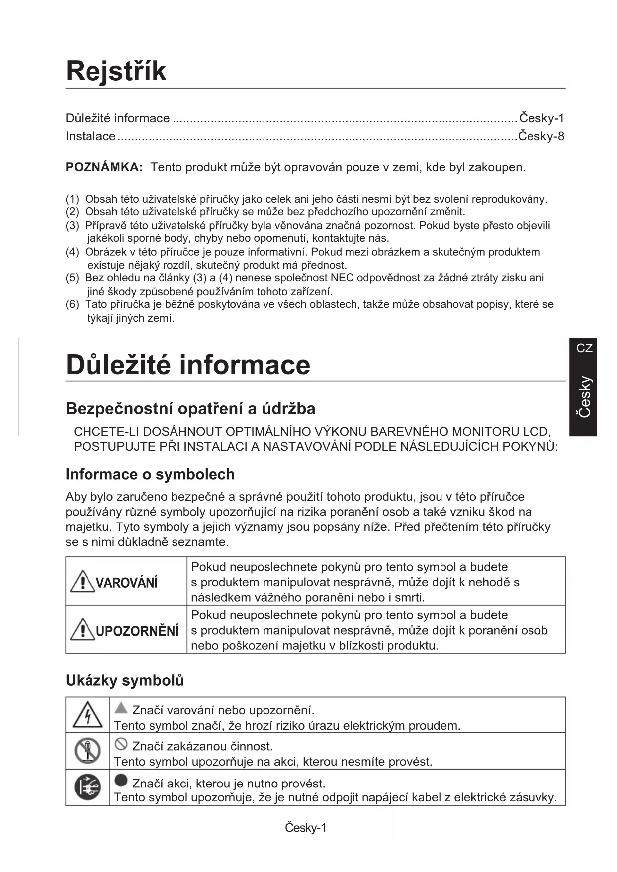 Česky Důležité informace ....................................................................................................Česky-1 Instalace ....................................................................................................................Česky-8 Rejstřík POZNÁMKA: Tento produkt může být opravován pouze v zemi, kde byl zakoupen. (1) Obsah této uživatelské příručky jako celek ani jeho části nesmí být bez svolení reprodukovány.(2) Obsah této uživatelské příručky se může bez předchozího upozornění změnit.(3) Přípravě této uživatelské příručky byla věnována značná pozornost. Pokud byste přesto objevili jakékoli sporné body, chyby nebo opomenutí, kontaktujte nás.(4) Obrázek v této příručce je pouze informativní. Pokud mezi obrázkem a skutečným produktem existuje nějaký rozdíl, skutečný produkt má přednost.(5) Bez ohledu na články (3) a (4) nenese společnost NEC odpovědnost za žádné ztráty zisku ani jiné škody způsobené používáním tohoto zařízení.(6) Tato příručka je běžně poskytována ve všech oblastech, takže může obsahovat popisy, které se týkají jiných zemí. Důležité informace Bezpečnostní opatření a údržba CHCETE-LI DOSÁHNOUT OPTIMÁLNÍHO VÝKONU BAREVNÉHO MONITORU LCD, POSTUPUJTE PŘI INSTALACI A NASTAVOVÁNÍ PODLE NÁSLEDUJÍCÍCH POKYNŮ: Informace o symbolech Aby bylo zaručeno bezpečné a správné použití tohoto produktu, jsou v této příručce používány různé symboly upozorňující na rizika poranění osob a také vzniku škod na majetku. Tyto symboly a jejich významy jsou popsány níže. Před přečtením této příručky se s nimi důkladně seznamte. VAROVÁNÍ Pokud neuposlechnete pokynů pro tento symbol a budete s produktem manipulovat nesprávně, může dojít k nehodě s následkem vážného poranění nebo i smrti. UPOZORNĚNÍ Pokud neuposlechnete pokynů pro tento symbol a budete s produktem manipulovat nesprávně, může dojít k poranění osob nebo poškození majetku v blízkosti produktu. Ukázky symbolů Značí varování nebo upozornění. Tento symbol značí, že hrozí riziko úrazu elektrickým proudem. Značí zakázanou činnost. Tento symbol upozorňuje na akci, kterou nesmíte provést. Značí akci, kterou je nutno provést. Tento symbol upozorňuje, že je nutné odpojit napájecí kabel z elektrické zásuvky.Česky-2 VAROVÁNÍ