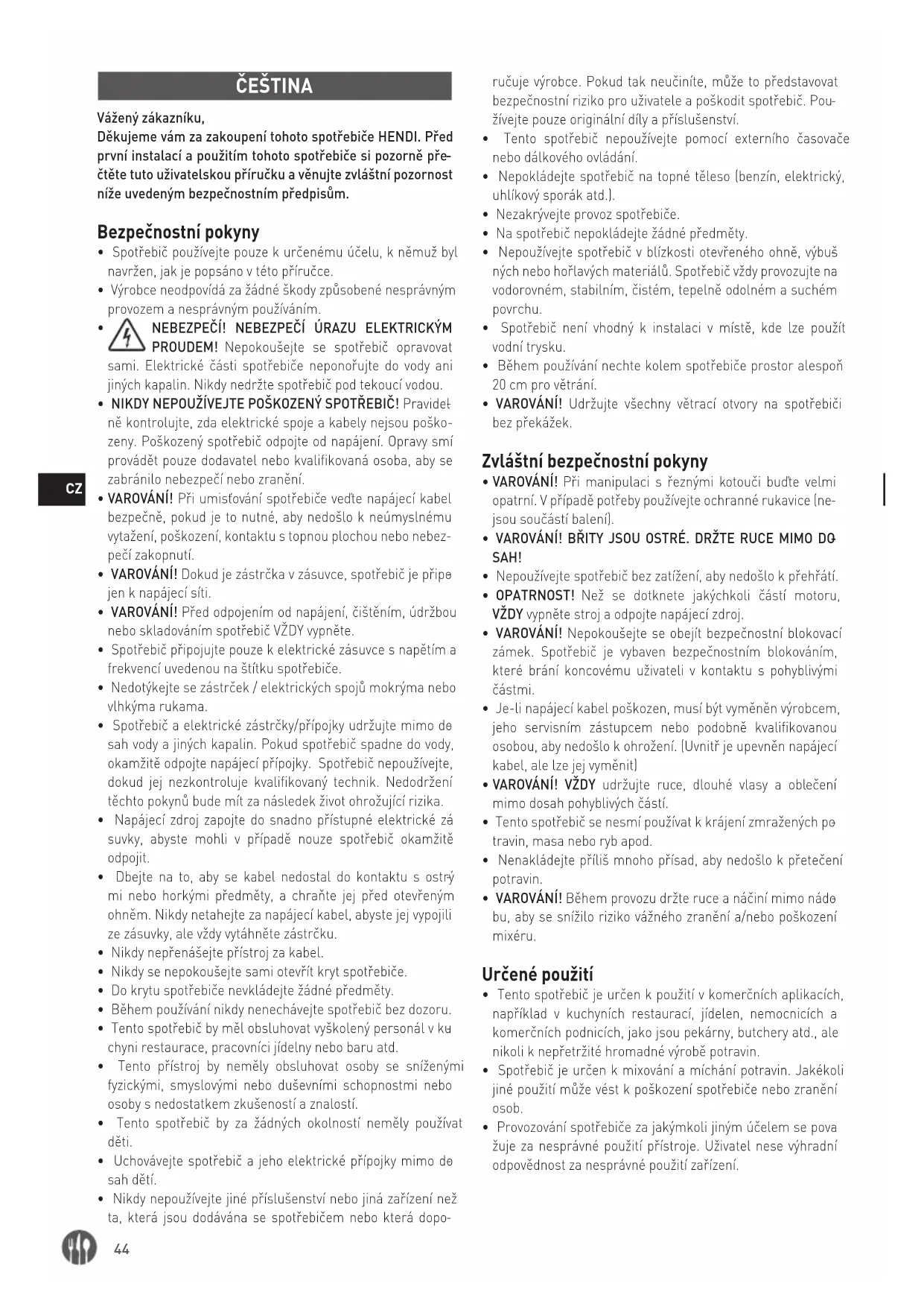 - Spotřebič je určen k mixování a míchání potravin. Jakékoli jiné použití může vést k poškození spotřebiče nebo zranění osob.
