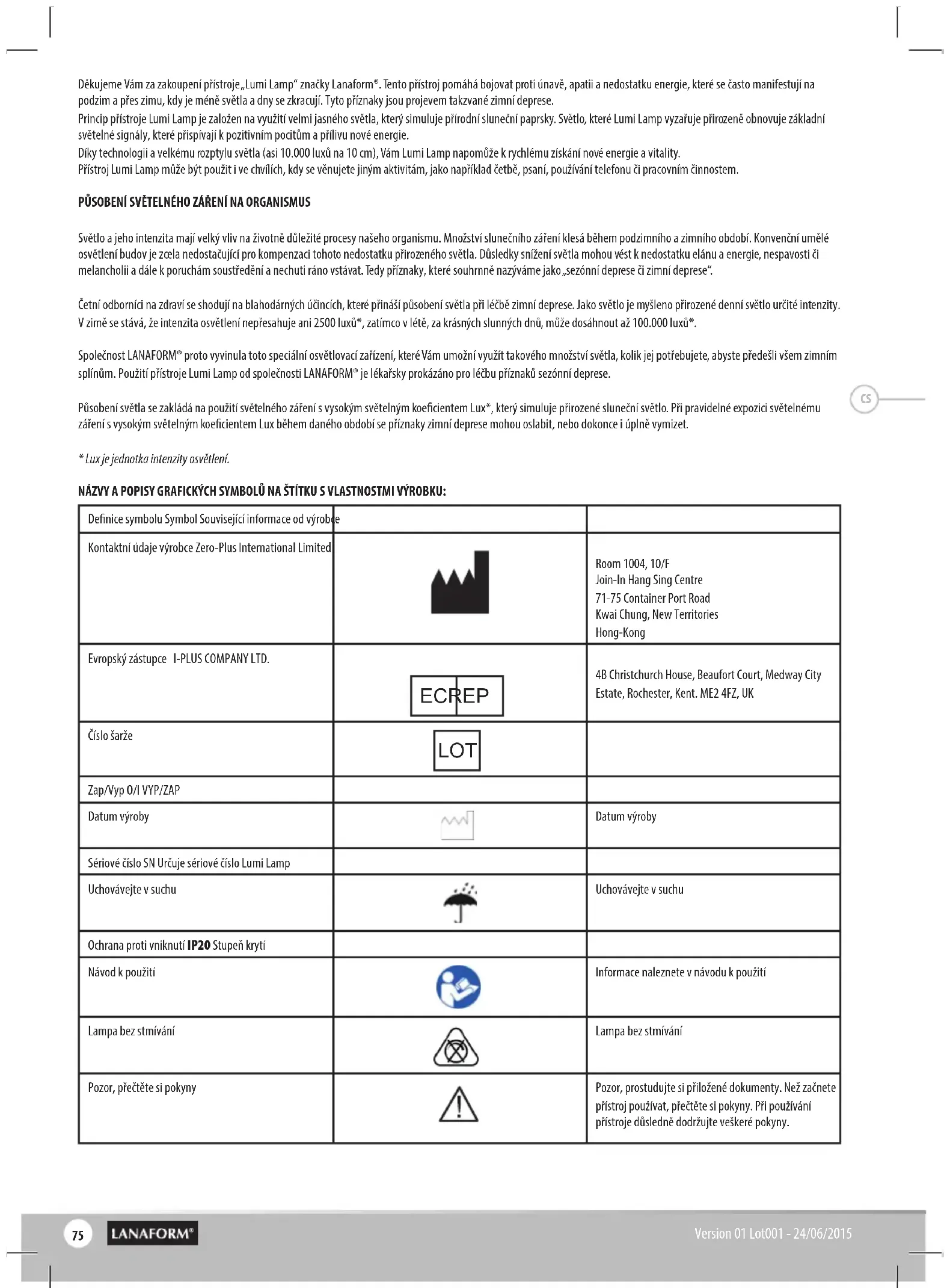 Medicinteknisk produkt Klass IIa. Vi, företaget LANAFORM, försäkrar att den medicintekniska produkten ”Lumi Lamp varuparti 001” följer EU-direktiv 93/42/EG vad gäller de medicinska bestämmelserna och dess senaste ändring 2007/47/EG. KONTAKTUPPGIFTER Apparaten har tillverkats av: Zero-Plus International Limited Room 1004, 10/F., Join-In Hang Sing Centre, 71-75 Container Port Road, Kwai Chung, New Territories, Hong Kong Apparaten har distribuerats av: Lanaform SA Rue de La légende 55, B-4141 Belgium Godkänd Europarepresentant: I-Plus Company Ltd. 4B Christchurch House, Beaufort Court, Medway City Estate, Rochester, Kent. ME2 4FZ, UK SV75 Version 01 Lot001 - 24/06/2015 Děkujeme Vám za zakoupení přístroje „Lumi Lamp“ značky Lanaform®. Tento přístroj pomáhá bojovat proti únavě, apatii a nedostatku energie, které se často manifestují na podzim a přes zimu, kdy je méně světla a dny se zkracují. Tyto příznaky jsou projevem takzvané zimní deprese. Princip přístroje Lumi Lamp je založen na využití velmi jasného světla, který simuluje přírodní sluneční paprsky. Světlo, které Lumi Lamp vyzařuje přirozeně obnovuje základní světelné signály, které přispívají k pozitivním pocitům a přílivu nové energie. Díky technologii a velkému rozptylu světla (asi 10.000 luxů na 10 cm), Vám Lumi Lamp napomůže k rychlému získání nové energie a vitality. Přístroj Lumi Lamp může být použit i ve chvílích, kdy se věnujete jiným aktivitám, jako například četbě, psaní, používání telefonu či pracovním činnostem. PŮSOBENÍ SVĚTELNÉHO ZÁŘENÍ NA ORGANISMUS Světlo a jeho intenzita mají velký vliv na životně důležité procesy našeho organismu. Množství slunečního záření klesá během podzimního a zimního období. Konvenční umělé osvětlení budov je zcela nedostačující pro kompenzaci tohoto nedostatku přirozeného světla. Důsledky snížení světla mohou vést k nedostatku elánu a energie, nespavosti či melancholii a dále k poruchám soustředění a nechuti ráno vstávat. Tedy příznaky, které souhrnně nazýváme jako „sezónní deprese či zimní deprese“. Četní odborníci na zdraví se shodují na blahodárných účincích, které přináší působení světla při léčbě zimní deprese. Jako světlo je myšleno přirozené denní světlo určité intenzity. V zimě se stává, že intenzita osvětlení nepřesahuje ani 2500 luxů*, zatímco v létě, za krásných slunných dnů, může dosáhnout až 100.000 luxů*. Společnost LANAFORM® proto vyvinula toto speciální osvětlovací zařízení, které Vám umožní využít takového množství světla, kolik jej potřebujete, abyste předešli všem zimním splínům. Použití přístroje Lumi Lamp od společnosti LANAFORM® je lékařsky prokázáno pro léčbu příznaků sezónní deprese. Působení světla se zakládá na použití světelného záření s vysokým světelným koecientem Lux*, který simuluje přirozené sluneční světlo. Při pravidelné expozici světelnému záření s vysokým světelným koecientem Lux během daného období se příznaky zimní deprese mohou oslabit, nebo dokonce i úplně vymizet.