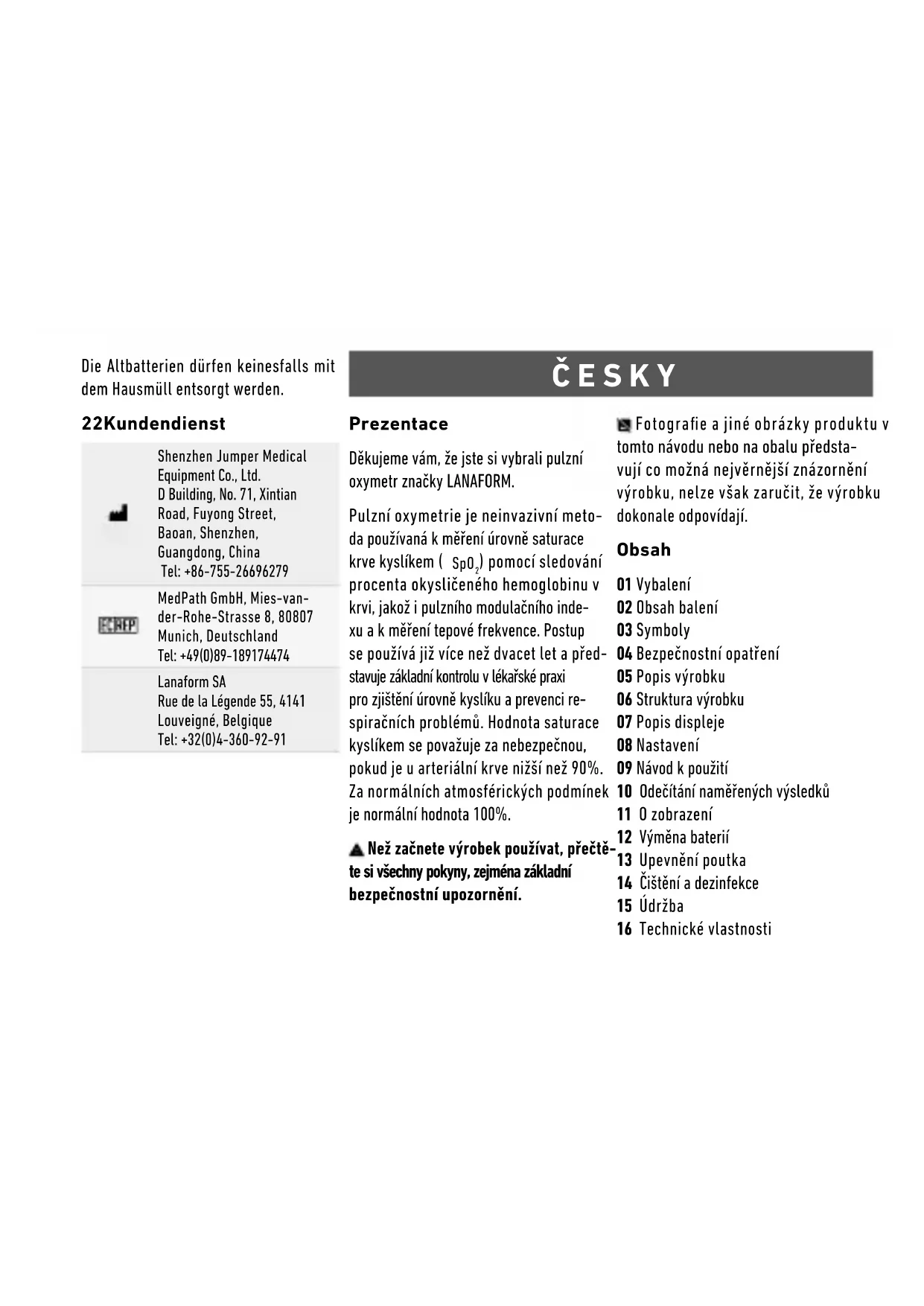 - Oxymetr není vhodný pro dlouhodobé monitorování. 18 Uskladnění a doprava Přístroj lze převážet běžnými přepravními prostředky. Během přepravy se vyhýbejte vibracím, nárazům nebo dešti. Přístroj musí být zabalen a skladován v dobře větrané místnosti bez korozivních plynů. Okolní teplota musí být mezi -10°C a +50°C, relativní vlhkost by měla být mezi 10% a 93% (bez kondenzace) a atmosféric- ký tlak by měl být 50-106 kPa. 19 Pokyny a prohlášení výrobce · Elektromag- netické záření Pokyny a prohlášení výrobce · Elektromagnetické záření · Pro všechna zařízení a systémy Pokyny a prohlášení výrobce – Elektromagnetické záření Pulzní oxymetr PO-100 je určený pro použití v elektromagnetickém prostředí specikovaném níže. Uživatel by se měl ujistit, že pulzní oxymetr PO- 100 používá v tomto prostředí. Emisní testy Shoda Elektromagnetické prostředí - Pokyny RF emise · CISPR 11 Skupina 1 Pulzní oxymetr PO-100 využívá vysokofrekvenční energii pouze pro své vnitřní funkce. Vysokofrekvenční záření je tudíž velmi nízké a nemělo by způsobit poškození elektronického vybavení v okolí.Pokyny a prohlášení výrobce – Elektromagnetické záření RF emise · CISPR 11 Třída B Pulzní oxymetr PO-100 je vhodný pro použití ve všech provozovnách, včetně domácích zařízení a zařízení přímo napojených na veřejnou síť nízkého napětí, které napájí tyto budovy a slouží pro domácí využití. 20 Omezená záruka Společnost LANAFORM se zaručuje, že tento výrobek je bez jakékoliv vady ma- teriálu či zpracování, a to od data prodeje po dobu dvou let, s výjimkou níže uvede- ných specikací. Záruka společnosti LANAFORM se ne- vztahuje na škody způsobené běžným používáním tohoto výrobku. Mimo jiné se záruka v rámci tohoto výroku společnosti LANAFORM nevztahuje na škody způsobe- né chybným nebo nevhodným používáním či jakýmkoliv špatným užíváním, nehodou, připojením nedovolených doplňků, změnou provedenou na výrobku či jiným zásahem jakékoliv povahy, na který nemá společ- nost LANAFORM vliv. Společnost LANAFORM nenese odpověd- nost za jakoukoliv škodu na doplňcích, ani za následné či speciální škody. Veškeré záruky vztahující se na způsobi- lost výrobku jsou omezeny na období dvou let od prvního zakoupení pod podmínkou, že při reklamaci musí být předložen do- klad o zakoupení tohoto zboží. Po přijetí zboží k reklamaci, společnost LANAFORM v závislosti na situaci toto za- řízení opraví či nahradí a následně vám ho odešle zpět. Záruku lze uplatňovat výhrad- ně prostřednictvím Servisního střediska společnosti LANAFORM. Jakákoliv údrž- ba tohoto zařízení, která by byla svěřena jiné osobě než pracovníkům Servisního střediska společnosti LANAFORM, ruší platnost záruky. 21 Rady z oblasti likvidace odpadů Celé balení je tvořeno materiály bez ne- bezpečných dopadů na životní prostředí, které tedy lze ukládat ve střediscích pro třídění odpadu za účelem následného dru- hotného využití. Papírový obal lze vyhodit do kontejnerů k tomu určených. Ostatní obalové materiály musí být předány do recyklačního střediska. V případě ztráty zájmu o další používání tohoto zařízení je zlikvidujte způsobem ohleduplným k životnímu prostředí a v souladu s platnou právní úpravou. Odstraňte však baterie a tyto odevzdejte do sběrných nádob k tomu určených pro následnou recyklaci. Použité baterie nesmí být v žádném pří- padě likvidovány s běžným odpadem z domácnosti.22 Poprodejní servis Shenzhen Jumper Medical Equipment Co., Ltd. D Building, No. 71, Xintian Road, Fuyong Street, Baoan, Shenzhen, Guangdong, China Tel: +86-755-26696279 MedPath GmbH, Mies-van- der-Rohe-Strasse 8, 80807 Munich, Deutschland Tel: +49(0)89-189174474 Lanaform SA Rue de la Légende 55, 4141 Louveigné, Belgique Tel: +32(0)4-360-92-91 SLOVENČINA Balenie Ďakujeme, že ste si vybrali pulzný oxi- meter LANAFORM Pulzná oximetria je neinvazívna metó- da používaná meranie úrovne nasýtenia krvi kyslíkom (SpO