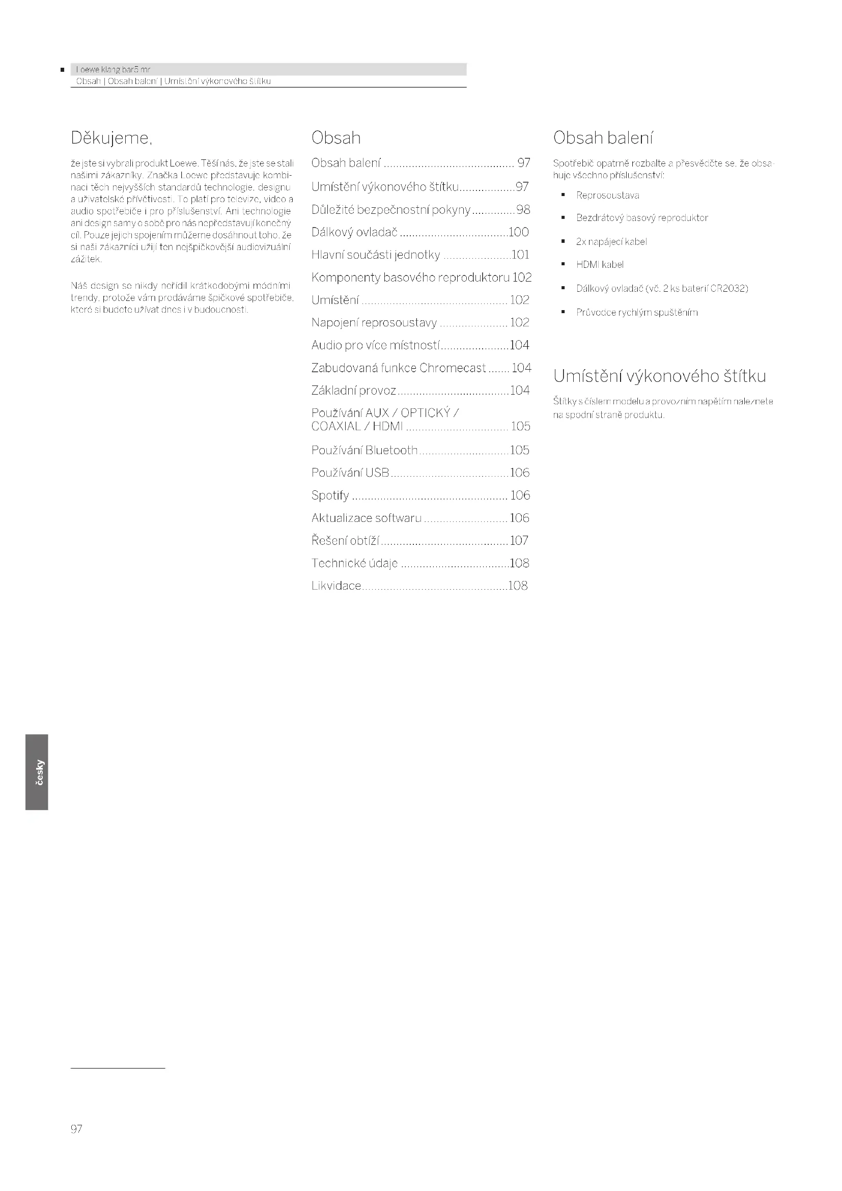 - Loewe klang bar5 mr allemand česky Obsah | Obsah balení | Umístění výkonového štítku Děkujeme, že jste si vybrali produkt Loewe. Těší nás, že jste se stali našimi zákazníky. Značka Loewe představuje kombi- naci těch nejvyšších standardů technologie, designu a uživatelské přívětivosti. To platí pro televize, video a audio spotřebiče i pro příslušenství. Ani technologie ani design samy o sobě pro nás nepředstavují konečný cíl. Pouze jejich spojením můžeme dosáhnout toho, že si naši zákazníci užijí ten nejšpičkovější audiovizuální zážitek. Náš design se nikdy neřídil krátkodobými módními trendy, protože vám prodáváme špičkové spotřebiče, které si budete užívat dnes i v budoucnosti. Obsah Obsah balení p. 97