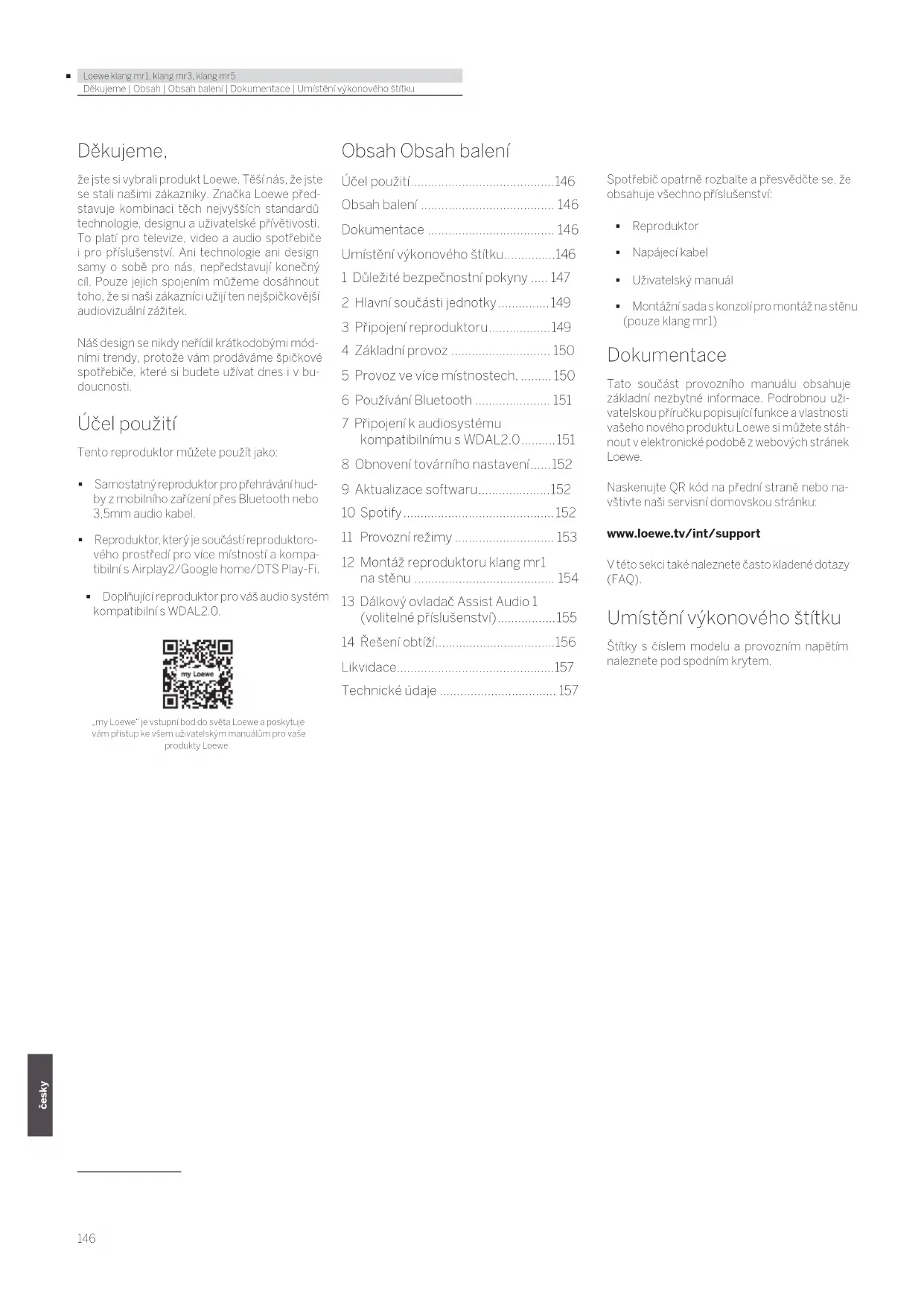 - Loewe klang mr1, klang mr3, klang mr5 italiano polskiDěkujeme | Obsah | Obsah balení | Dokumentace | Umístění výkonového štítku Děkujeme, že jste si vybrali produkt Loewe. Těší nás, že jste se stali našimi zákazníky. Značka Loewe před- stavuje kombinaci těch nejvyšších standardů technologie, designu a uživatelské přívětivosti. To platí pro televize, video a audio spotřebiče i pro příslušenství. Ani technologie ani design samy o sobě pro nás, nepředstavují konečný cíl. Pouze jejich spojením můžeme dosáhnout toho, že si naši zákazníci užijí ten nejšpičkovější audiovizuální zážitek. Náš design se nikdy neřídil krátkodobými mód- ními trendy, protože vám prodáváme špičkové spotřebiče, které si budete užívat dnes i v bu- doucnosti. Účel použití Tento reproduktor můžete použít jako: Samostatný reproduktor pro přehrávání hud- by z mobilního zařízení přes Bluetooth nebo 3,5mm audio kabel. Reproduktor, který je součástí reproduktoro- vého prostředí pro více místností a kompa- tibilní s Airplay2/Google home/DTS Play-Fi. Doplňující reproduktor pro váš audio systém kompatibilní s WDAL2.0. „my Loewe“ je vstupní bod do světa Loewe a poskytuje vám přístup ke všem uživatelským manuálům pro vaše produkty Loewe. Obsah Obsah balení Spotřebič opatrně rozbalte a přesvědčte se, že obsahuje všechno příslušenství: Reproduktor Napájecí kabel Uživatelský manuál Montážní sada s konzolí pro montáž na stěnu (pouze klang mr1) Dokumentace Tato součást provozního manuálu obsahuje základní nezbytné informace. Podrobnou uži- vatelskou příručku popisující funkce a vlastnosti vašeho nového produktu Loewe si můžete stáh- nout v elektronické podobě z webových stránek Loewe. Naskenujte QR kód na přední straně nebo na- vštivte naši servisní domovskou stránku: www.loewe.tv/int/support V této sekci také naleznete často kladené dotazy (FAQ). Umístění výkonového štítku Štítky s číslem modelu a provozním napětím naleznete pod spodním krytem. Účel použití p. 146