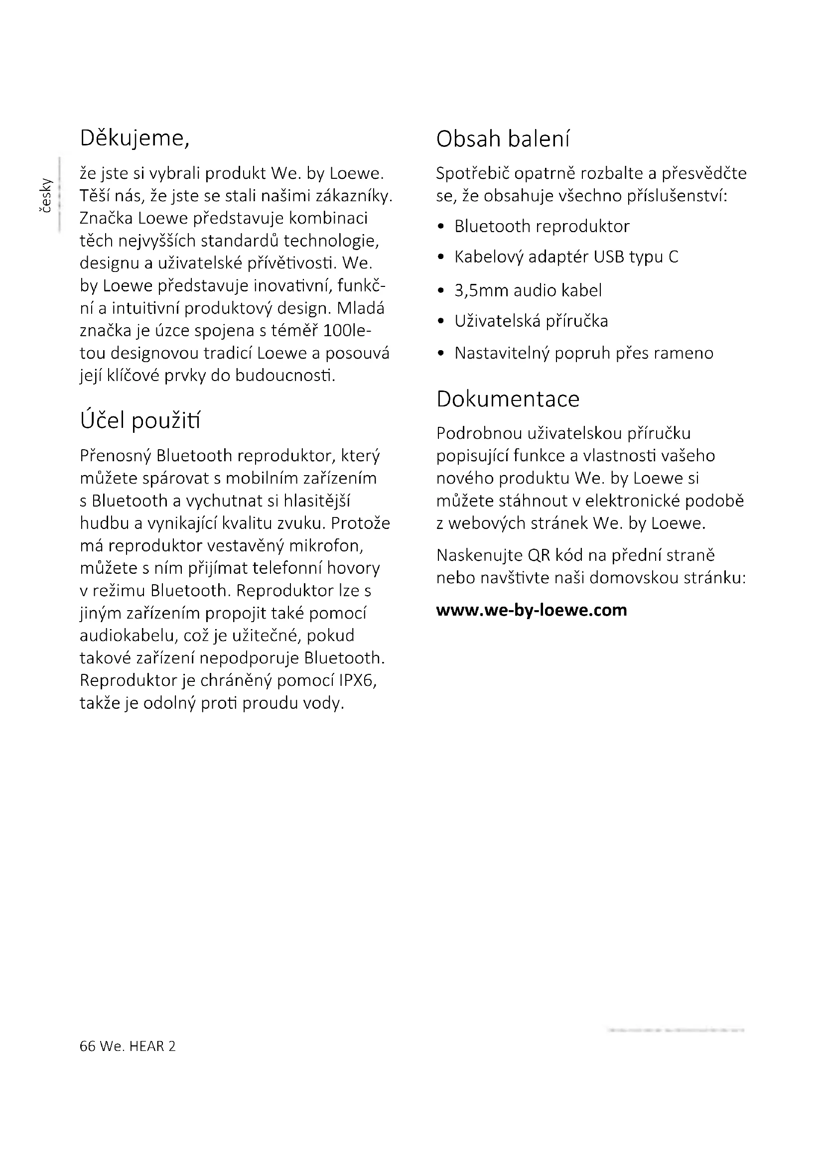 9 Ochrana IPX6 před vodou Toto zařízení má ochranu IPX6, což zna- mená, že ji nepoškodí silné proudy vody. Aby byla tato ochrana účinná, nesmí být k reproduktoru připojeno žádné zařízení prostřednictvím kabelu (např. telefon přes audio kabel nebo nabíječka přes USB kabel) a prostor s konektory musí být pevně utěsněn.72 We. HEAR 2 česky Řešení obží V případě poruchy zařízení doporučujeme zkontrolovat nejprve níže uvedený seznam, a pak teprve volat na asistenční linku. Problém Možná příčina Řešení/poznámky Reproduktor nejde zapnout. Je možné, že baterie je téměř vybitá. Dobijte reproduktor. Dobíjení reproduktoru trvá příliš dlouho. Vaše USB nabíječka dodává příliš málo proudu. Použijte 5V/2A USB nabíječku. Z reproduktoru nevychází zvuk a. Hlasitost je příliš nebo zcela ztlumená. b. S reproduktorem není spá- rované žádné zařízení. a. Sskněte několikrát tlačítko (+) nebo zvyšte hlasitost svého zařízení. b. Spárujte a spojte své Bluetooth zařízení. Zvuk je narušený a. Vaše Bluetooth zařízení je příliš daleko od repro- duktoru. b. Je přítomno bezdrátové rušení. a. Přemístěte své zařízení blíže k reproduktoru. b. Přesuňte reproduktor dále od jiných bezdrátových zařízení. Technické údaje Typ zařízení We. by Loewe: We. HEAR 2 Číslo součástí: 60702x10 Typ baterie: Vestavěná lithium-iontová 7,4V/4000mAh Nabíjecí proud: 5V / 2A Doba přehrávání: 15 – 17 h Doba dobíjení: 4 – 5 h Jednotka reproduktoru 2x 15 W RMS Ochrana před vodou IPX6 Verze Bluetooth V5.0 Výkon Bluetooth / frekvenční rozsah: Maximální výkon <10 mW při 2402–2480 MHz Protokoly Bluetooth: A2DP, AVRCP Rozměry zařízení (Š×V×H) 118×290×112 mm Hmotnost zařízení: 2 kg Okolní teplota: 0–35 °C Relativní vlhkost (nekondenzující): 20–70 %We. HEAR 2 73 česky74 We. HEAR 2 slovensky Ďakujeme, že ste si vybrali produkt We. by Loewe. Sme radi, že sta naším zákazníkom. V spoločnos Loewe kombinujeme najvyššie štandardy technológie, dizajnu a používateľskej jednoduchos. We. by Loewe znamená inovavny, funkčný a intuivny dizajn produktu. Mladá značka je úzko spojená s takmer sto rokov starou dizajnérskou tradíciou spoločnos Loewe a transformuje svoje kľúčové prvky do budúcnos. Zamýšľané použie Prenosný reproduktor Bluetooth, ktorý môžete spárovať s mobilným zariadením s technológiou Bluetooth a vychutnať si hudbu pri vyššej hlasitos a vynikajúcej kvalite zvuku. Zabudo- vaný mikrofón umožňuje používať reproduktor na príjem telefónnych hovorov v režime Bluetooth. K dispozícii je ež možnosť pripojiť reproduktor k zariadeniu pomocou zvukového kábla, čo je užitočné pri pripájaní zariadení bez podpory Bluetooth. Reproduktor má ochranu IPX6, vďaka čomu je odolný voči silným prúdom vody. Rozsah dodávky Opatrne vybaľte zariadenie a uiste sa, že je prítomné všetko príslušenstvo: