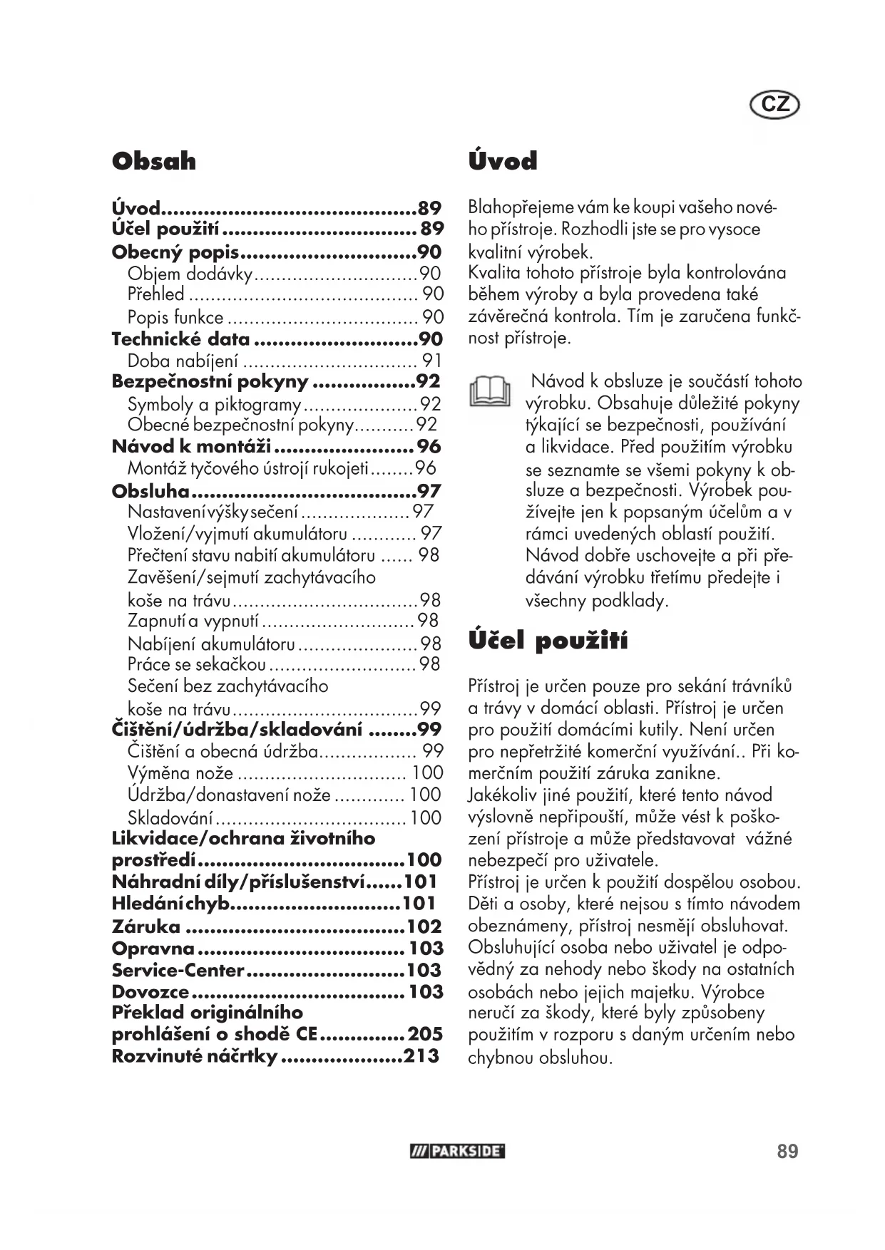 - Dovozce Úvod Blahopřejeme vám ke koupi vašeho nové- ho přístroje. Rozhodli jste se pro vysoce kvalitní výrobek. Kvalita tohoto přístroje byla kontrolována během výroby a byla provedena také závěrečná kontrola. Tím je zaručena funkč- nost přístroje. Návod k obsluze je součástí tohoto výrobku. Obsahuje důležité pokyny týkající se bezpečnosti, používání a likvidace. Před použitím výrobku se seznamte se všemi pokyny k ob- sluze a bezpečnosti. Výrobek pou- žívejte jen k popsaným účelům a v rámci uvedených oblastí použití. Návod dobře uschovejte a při pře- dávání výrobku třetímu předejte i všechny podklady. Účel použití Přístroj je určen pouze pro sekání trávníků a trávy v domácí oblasti. Přístroj je určen pro použití domácími kutily. Není určen pro nepřetržité komerční využívání p. 103