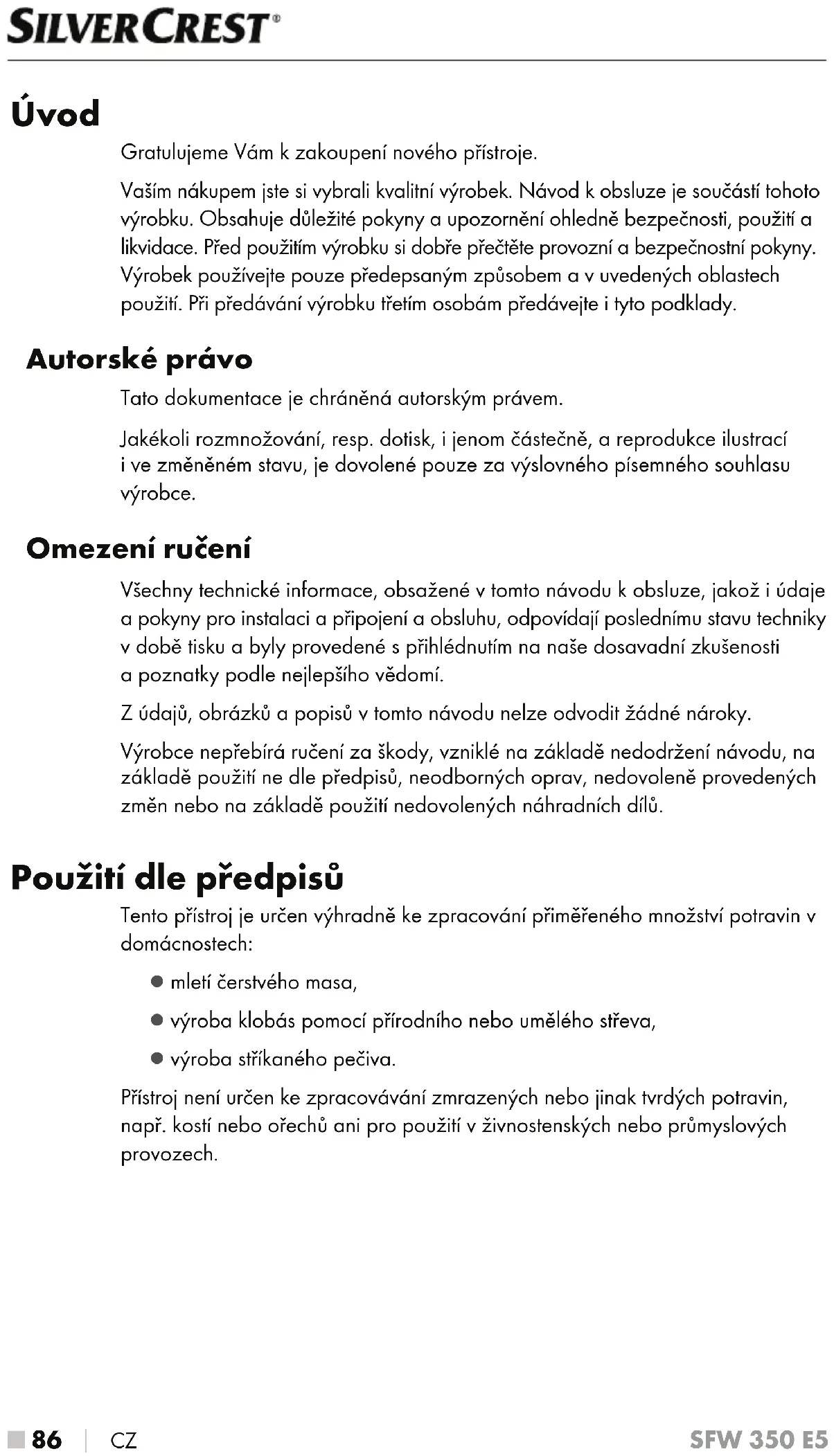 CZ SFW 350 E5 Úvod Gratulujeme Vám k zakoupení nového přístroje. Vaším nákupem jste si vybrali kvalitní výrobek. Návod k obsluze je součástí tohoto výrobku. Obsahuje důležité pokyny a upozornění ohledně bezpečnosti, použití a likvidace. Před použitím výrobku si dobře přečtěte provozní a bezpečnostní pokyny. Výrobek používejte pouze předepsaným způsobem a v uvedených oblastech použití. Při předávání výrobku třetím osobám předávejte i tyto podklady. Autorské právo Tato dokumentace je chráněná autorským právem. Jakékoli rozmnožování, resp. dotisk, i jenom částečně, a reprodukce ilustrací i ve změněném stavu, je dovolené pouze za výslovného písemného souhlasu výrobce. Omezení ručení Všechny technické informace, obsažené v tomto návodu k obsluze, jakož i údaje a pokyny pro instalaci a připojení a obsluhu, odpovídají poslednímu stavu techniky v době tisku a byly provedené s přihlédnutím na naše dosavadní zkušenosti a poznatky podle nejlepšího vědomí. Z údajů, obrázků a popisů v tomto návodu nelze odvodit žádné nároky. Výrobce nepřebírá ručení za škody, vzniklé na základě nedodržení návodu, na základě použití ne dle předpisů, neodborných oprav, nedovoleně provedených změn nebo na základě použití nedovolených náhradních dílů. Použití dle předpisů Tento přístroj je určen výhradně ke zpracování přiměřeného množství potravin v domácnostech: ▯ mletí čerstvého masa, ▯ výroba klobás pomocí přírodního nebo umělého střeva, ▯ výroba stříkaného pečiva. Přístroj není určen ke zpracovávání zmrazených nebo jinak tvrdých potravin, např. kostí nebo ořechů ani pro použití v živnostenských nebo průmyslových provozech.CZ