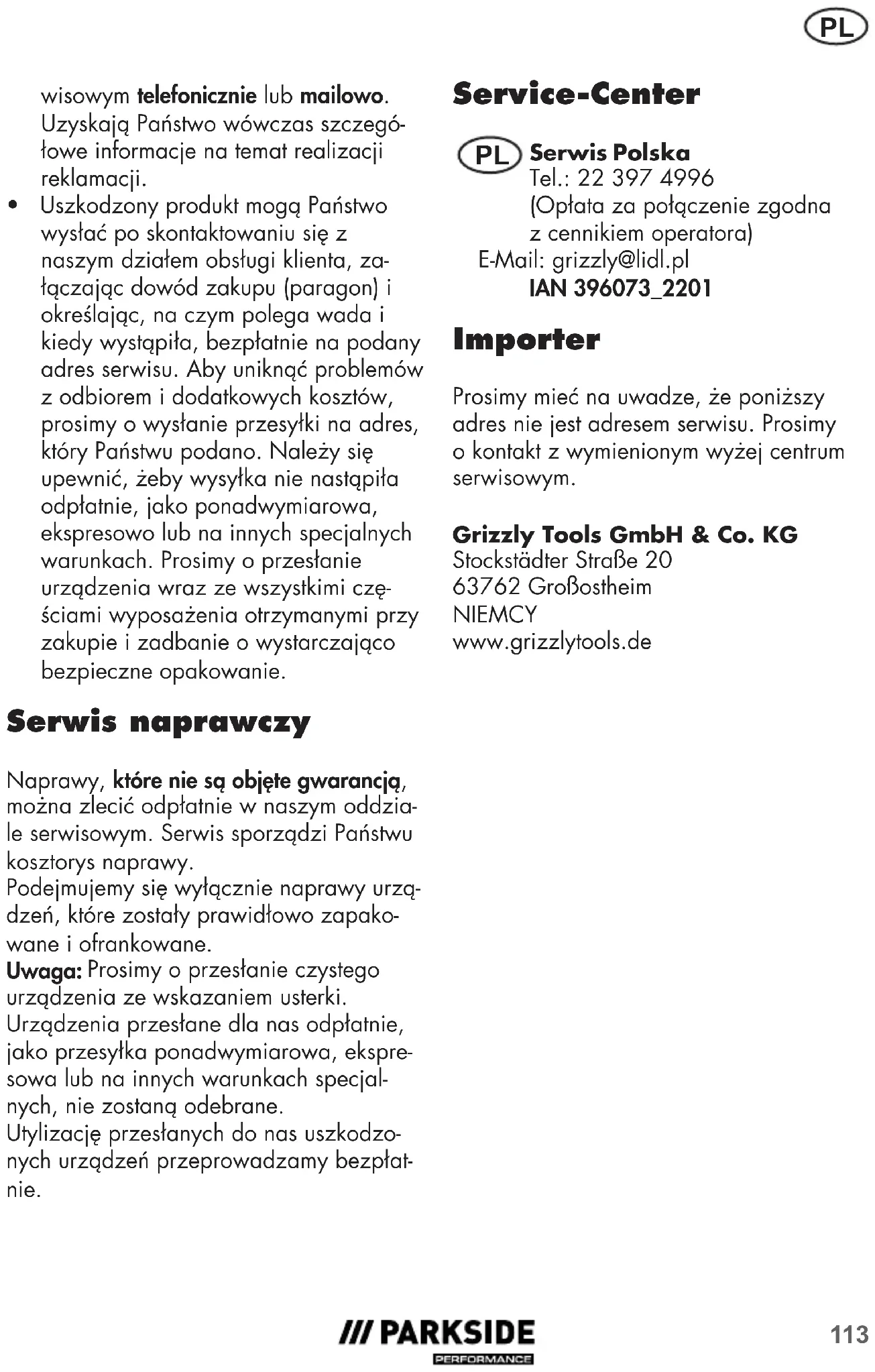 Servis Česko Tel.:800143873 E-Mail:grizzly@lidl.cz IAN 396073_2201 Dovozce Prosím,respektujte,ženásledujícíadresa neníadresouservisu.Nejdřívekontaktujte shorauvedenéservisnístředisko. Grizzly Tools GmbH & Co. KG StockstädterStraße20 63762 Großostheim NĚMECKO www.grizzlytools.deSK