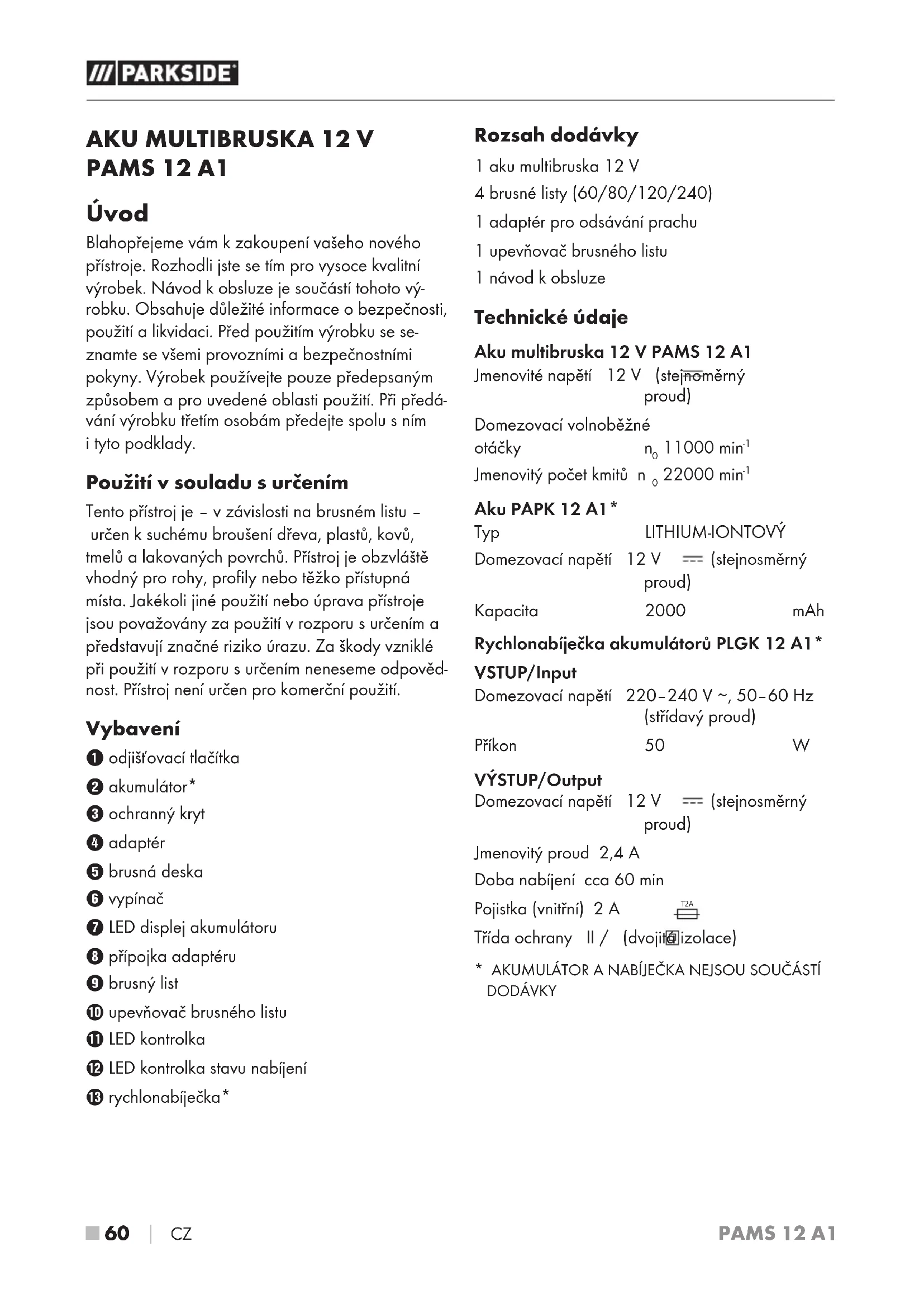 PAMS 12 A1 Úvod Blahopřejeme vám kzakoupení vašeho nového přístroje. Rozhodli jste se tím pro vysoce kvalitní výrobek. Návod kobsluze je součástí tohoto vý- robku. Obsahuje důležité informace obezpečnosti, použití a likvidaci. Před použitím výrobku se se- znamte se všemi provozními a bezpečnostními pokyny. Výrobek používejte pouze předepsaným způsobem a pro uvedené oblasti použití. Při předá- vání výrobku třetím osobám předejte spolu sním ityto podklady. Použití vsouladu surčením Tento přístroj je – vzávislosti na brusném listu – určen ksuchému broušení dřeva, plastů, kovů, tmelů a lakovaných povrchů. Přístroj je obzvláště vhodný pro rohy, profily nebo těžko přístupná místa. Jakékoli jiné použití nebo úprava přístroje jsou považovány za použití vrozporu surčením a představují značné riziko úrazu. Za škody vzniklé při použití vrozporu surčením neneseme odpověd- nost. Přístroj není určen pro komerční použití. Vybavení 1 odjišťovací tlačítka 2 akumulátor* 3 ochranný kryt 4 adaptér 5 brusná deska 6 vypínač 7 LED displej akumulátoru 8 přípojka adaptéru 9 brusný list 0 upevňovač brusného listu q LED kontrolka w LED kontrolka stavu nabíjení e rychlonabíječka* Rozsah dodávky 1 aku multibruska 12 V 4 brusné listy (60/80/120/240) 1 adaptér pro odsávání prachu 1 upevňovač brusného listu 1návod kobsluze Technické údaje Aku multibruska 12 V PAMS 12 A1 Jmenovité napětí 12 V (stejnoměrný proud) Domezovací volnoběžné otáčky n