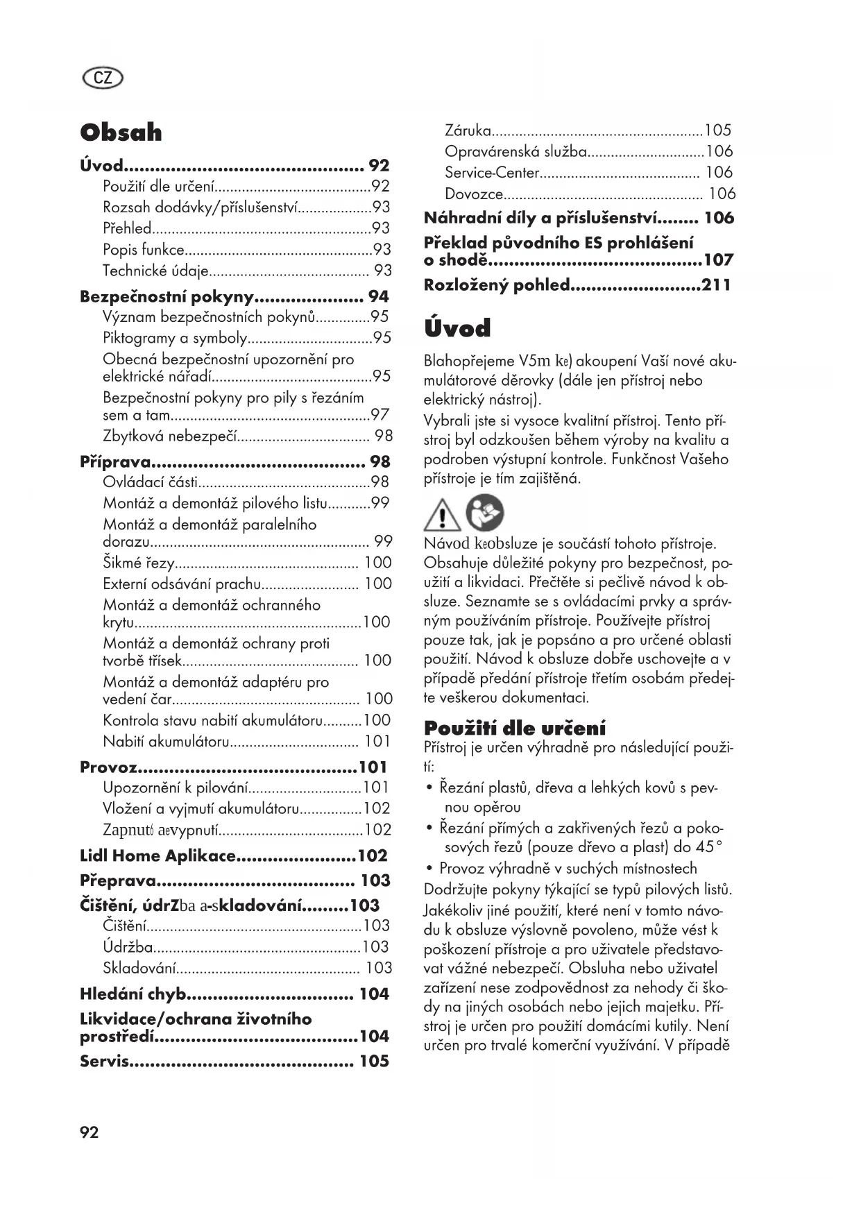 - Provoz výhradně v suchých místnostech Dodržujte pokyny týkající se typů pilových listů. Jakékoliv jiné použití, které není v tomto návo- du k obsluze výslovně povoleno, může vést k poškození přístroje a pro uživatele představo- vat vážné nebezpečí. Obsluha nebo uživatel zařízení nese zodpovědnost za nehody či ško- dy na jiných osobách nebo jejich majetku. Pří- stroj je určen pro použití domácími kutily. Není určen pro trvalé komerční využívání. V případě CZ93 komerčního použití záruka zaniká. Výrobce ne- ručí za škody způsobené nesprávným použitím nebo nesprávnou obsluhou. Přístroj je součástí série X20VTEAM a lze jej provozovat s akumulátory sé- rie X20VTEAM. Akumulátory série X20VTEAM se smí nabíjet pouze nabíječ- kami série X20VTEAM. Rozsah dodávky/ příslušenství Vybalte přístroj a zkontrolujte rozsah dodávky. Obalový materiál zlikvidujte správně dle před- pisů.
